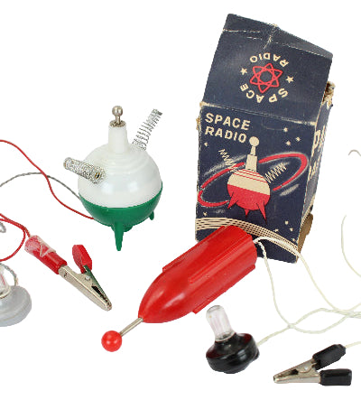 2 - Space Theme 1950's Crystal Radios- Red Hearever Rocket Radio & Satellite Space Radio