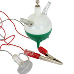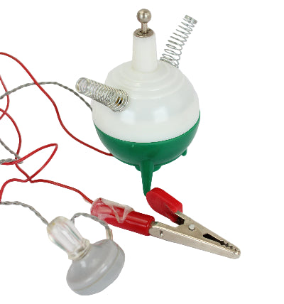 The Round Satellite era space radio was manufactured by Nasco Japan and measures about 2-3/4" tall (4-5/8" high when antenna is extended). The green and white satellite features two springs jutting out for appearance purposes. One of the wires attached to the grounding clip needs to be reattached via soldering or splicing.