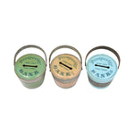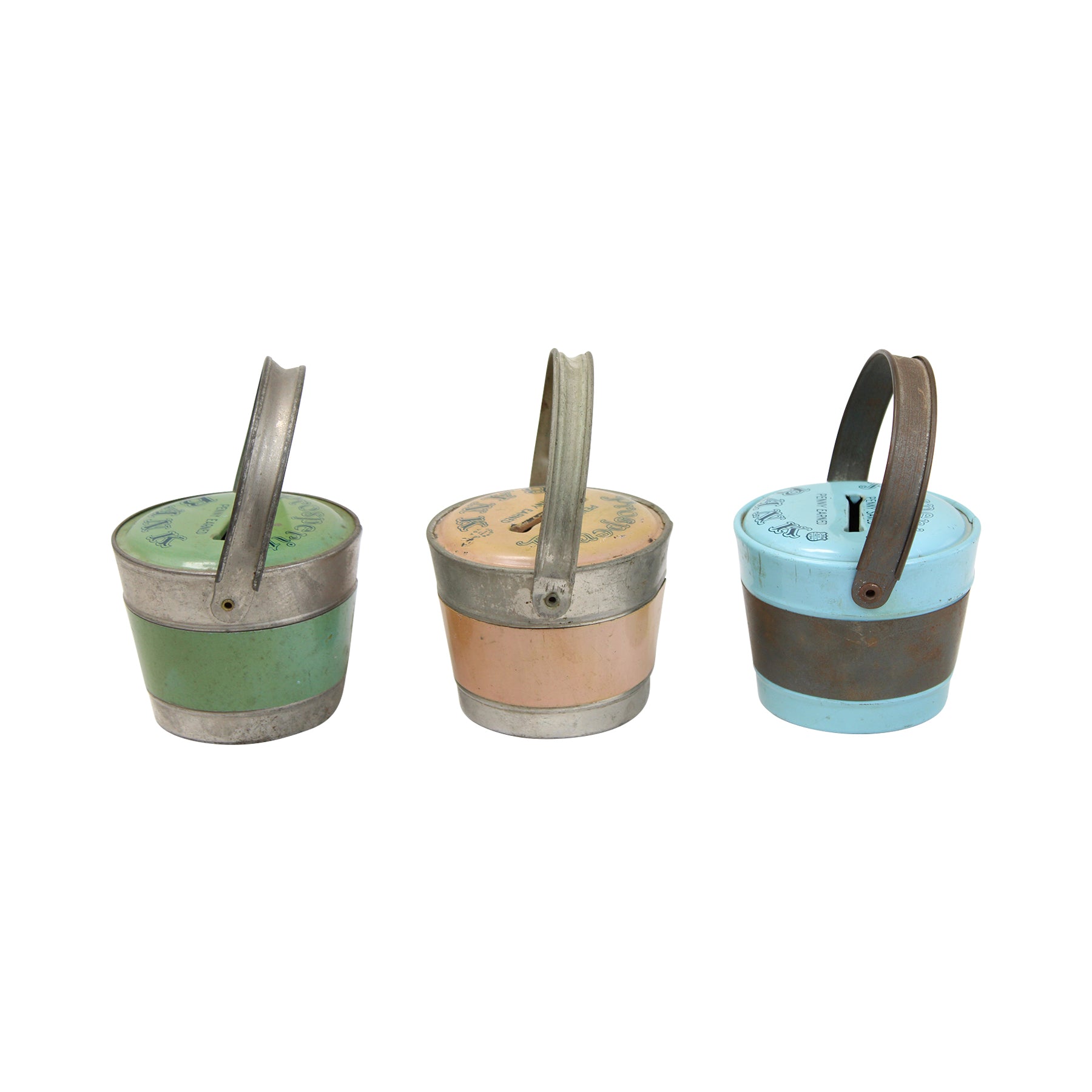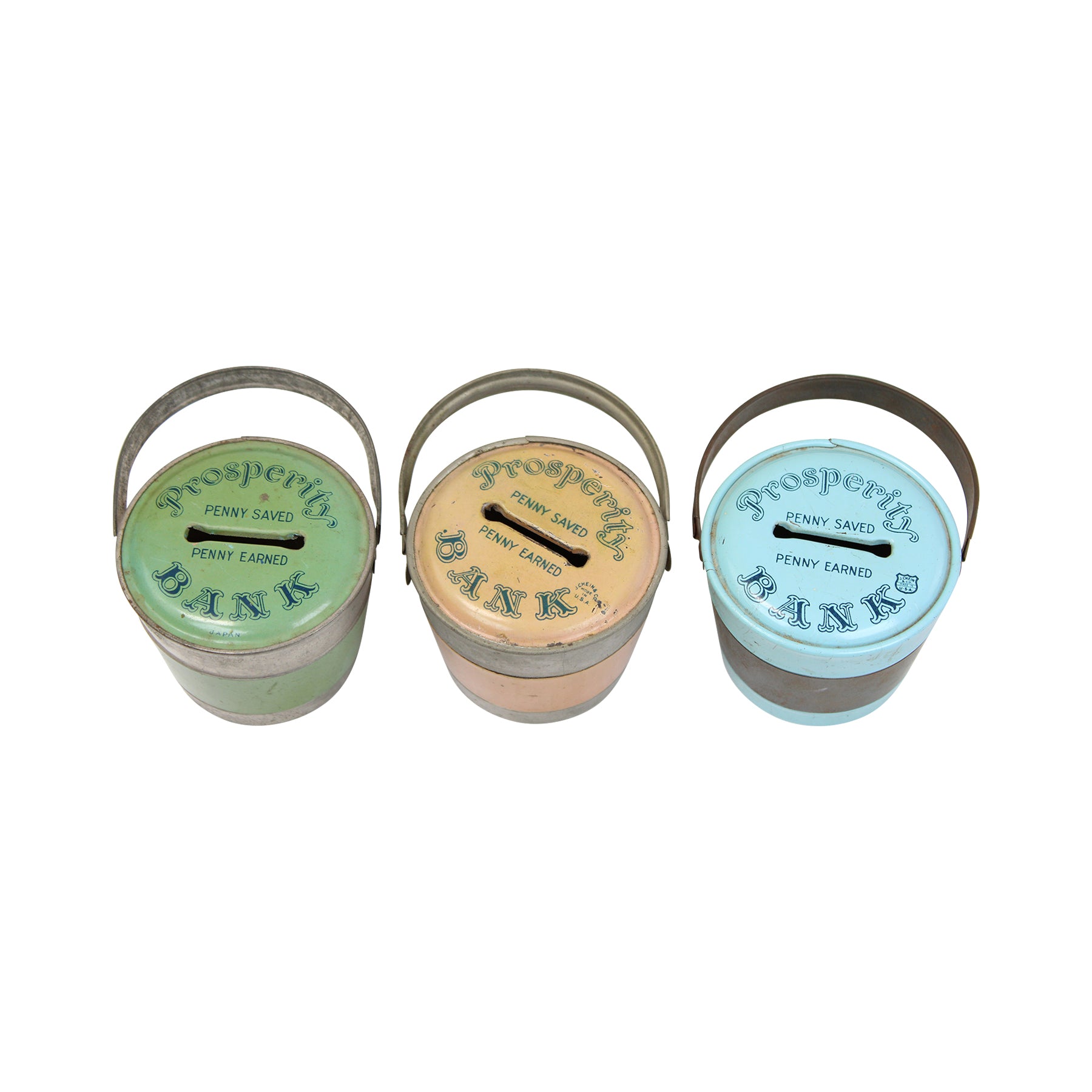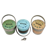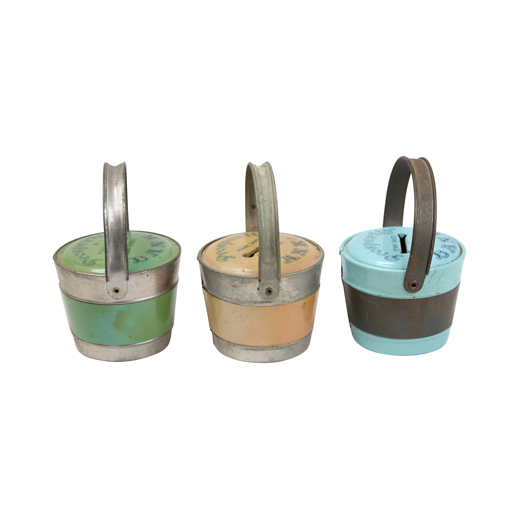 3 - 1930's Sand Bucket Tin Prosperity Banks- "Penny Saved; Penny Earned"