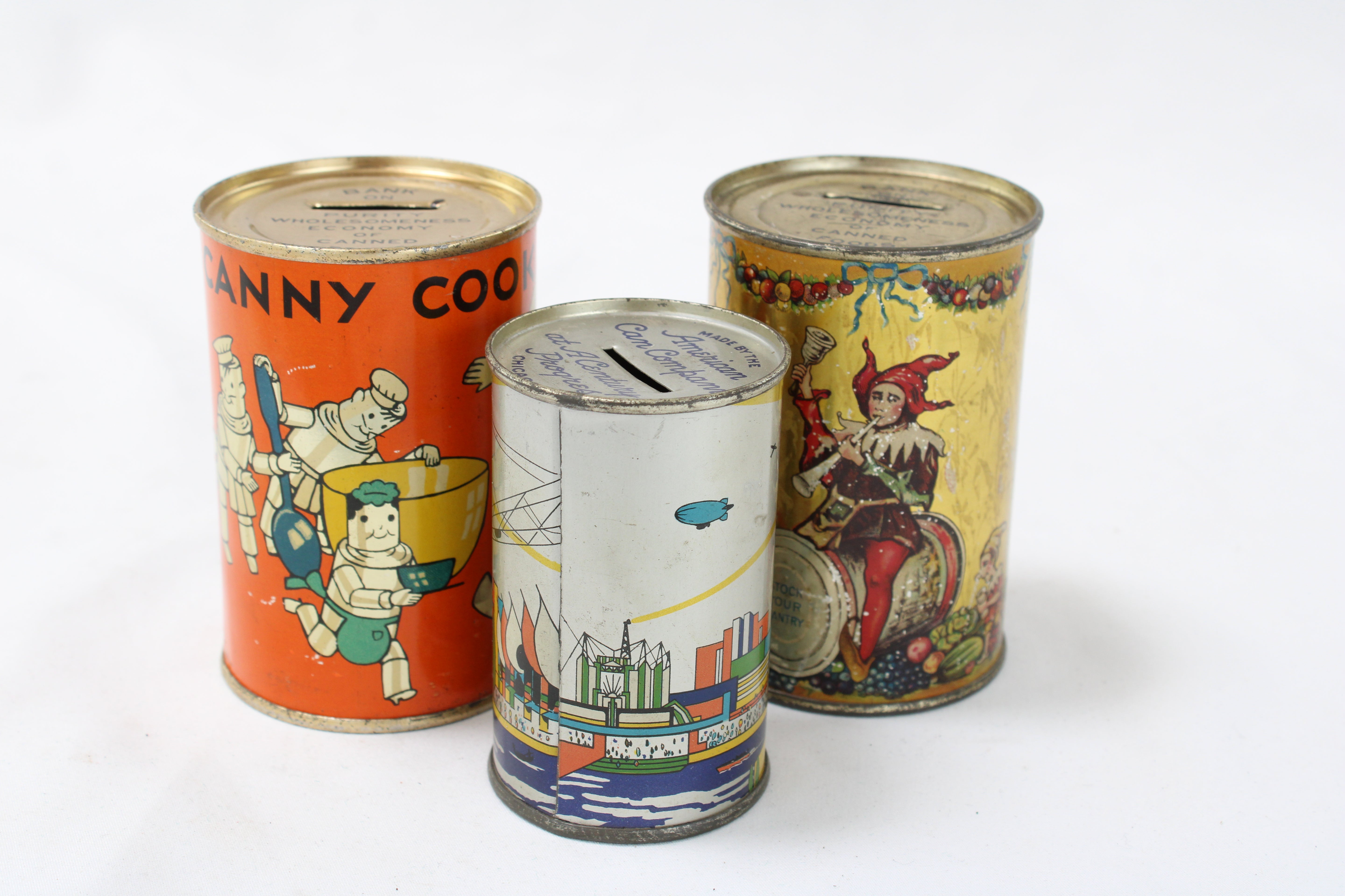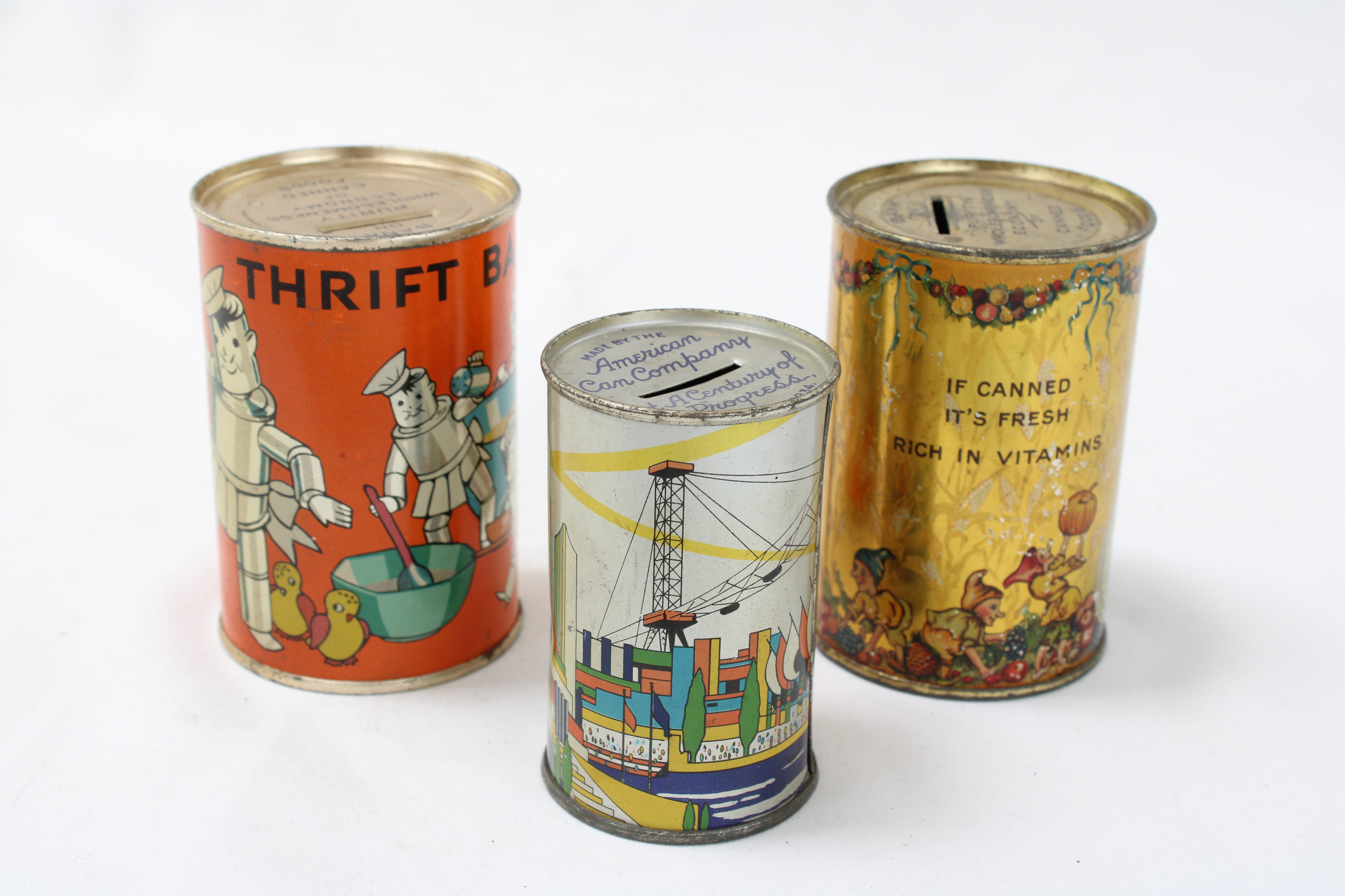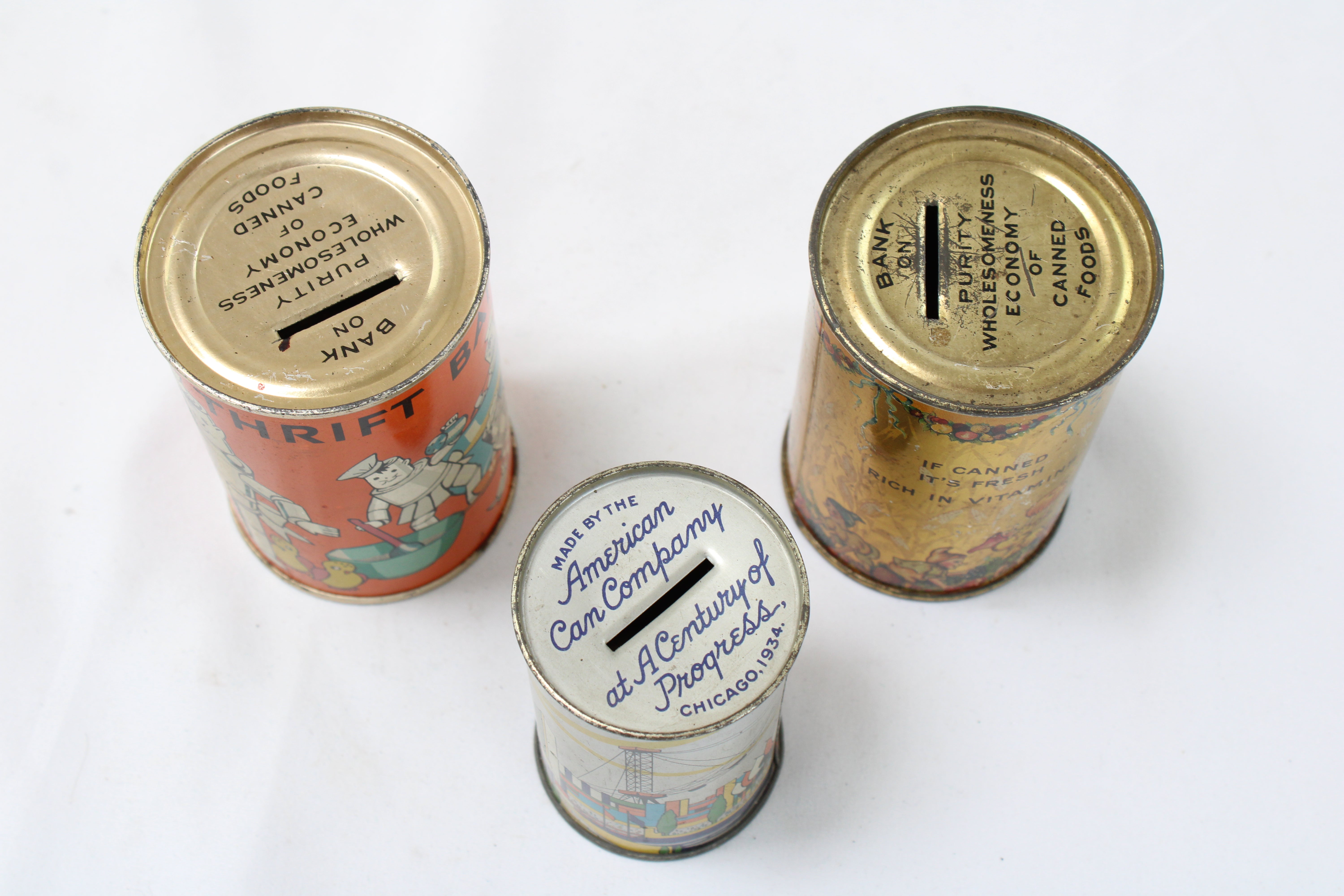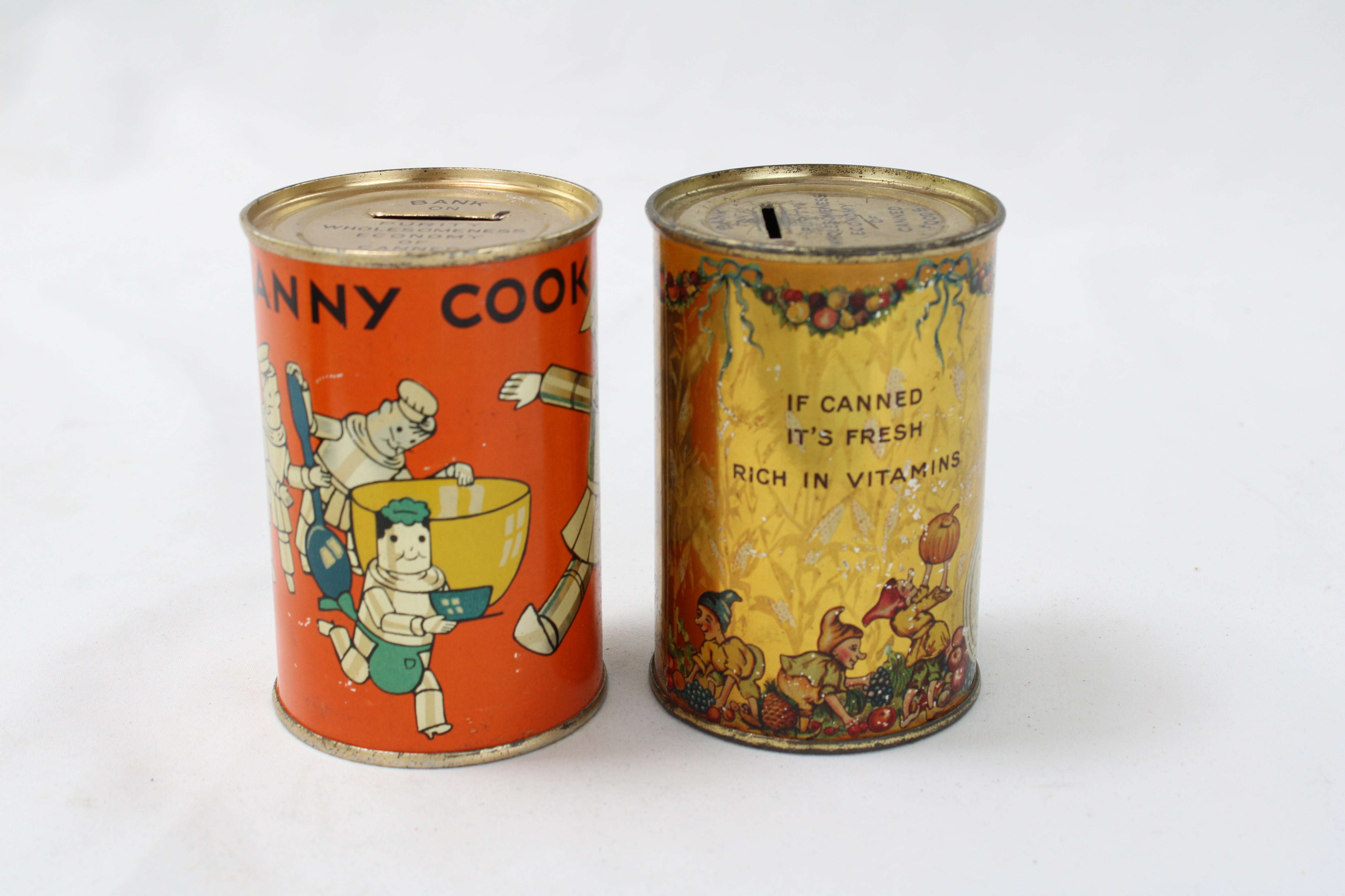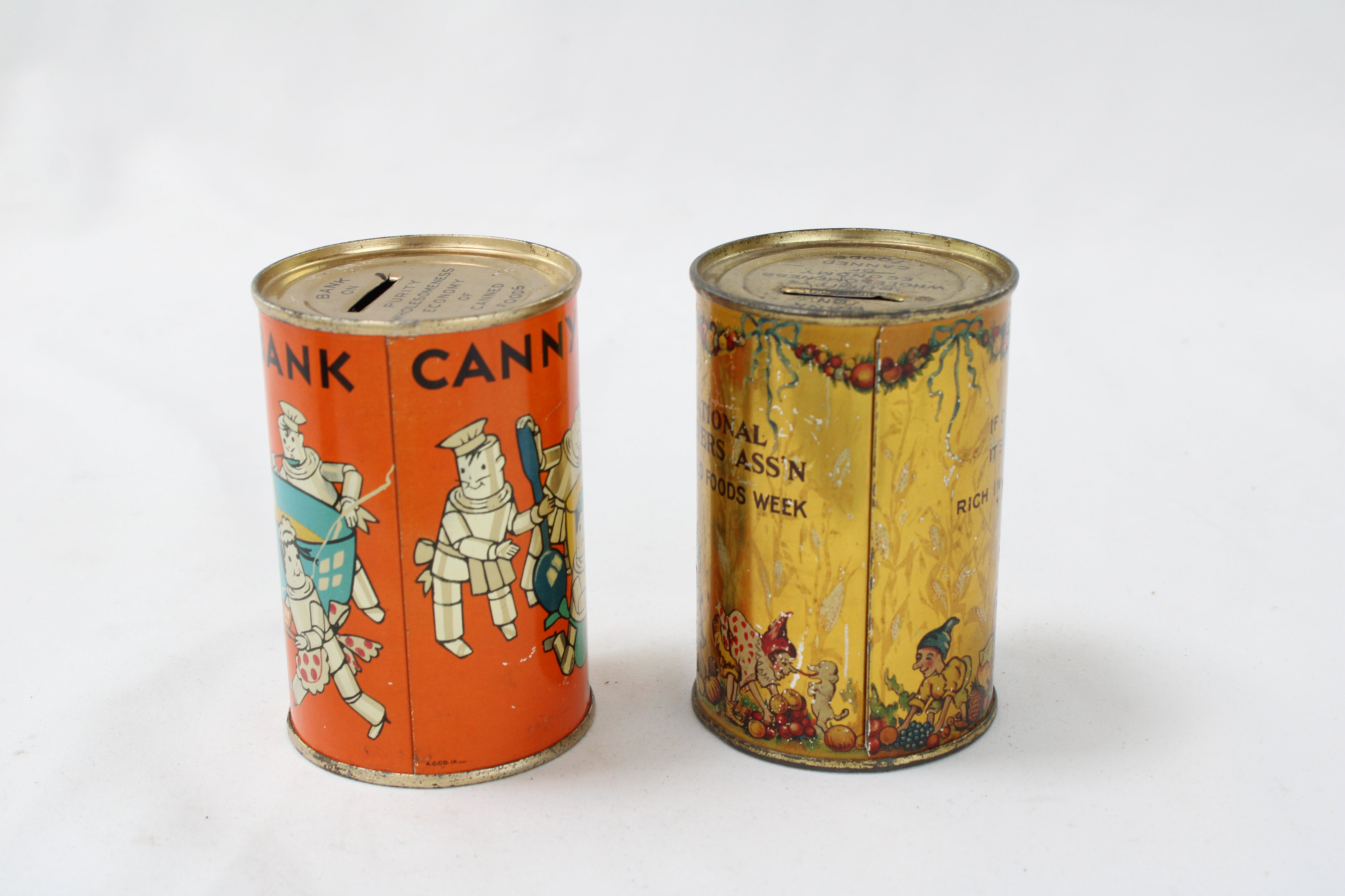 The National Canners Association (Washington D.C.) can bank features the words "Canny Cook Thrift Bank" with images of robot-like workers preparing food and beverages. The top of the can, where the coin slot is located, reads "Bank on purity, wholesomeness, economy of caned foods." The 2-5/8" diameter and 4" tall can is in very good condition, and the bottom of the can is stamped "National Canners Association."
