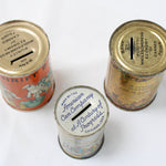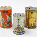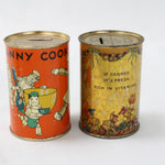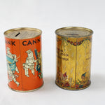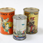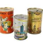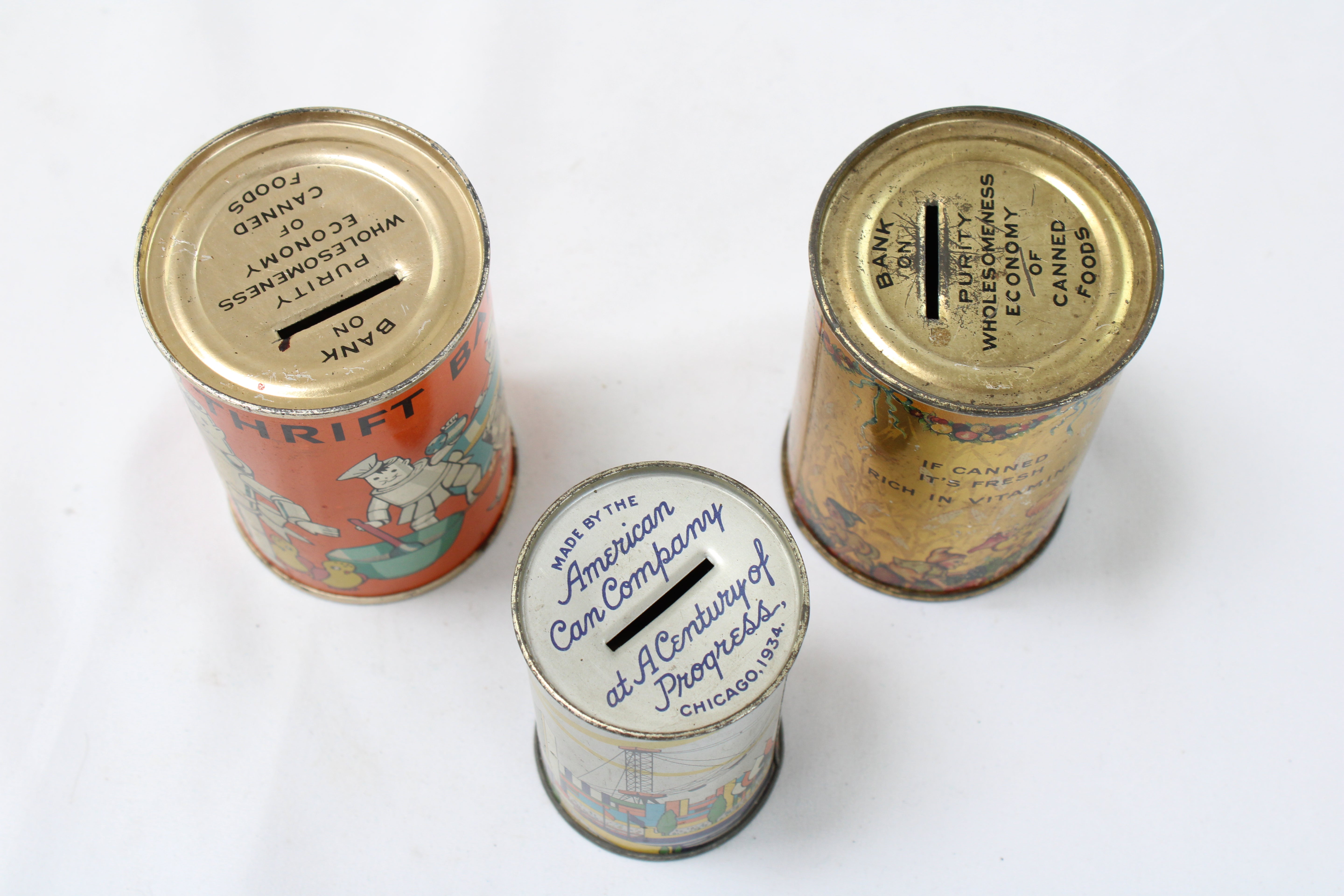 The other American Can company bank included with this lot has a bright shiny gold background that features lithograph graphics of Harlequin elves, vegetables, fruit, and dogs.