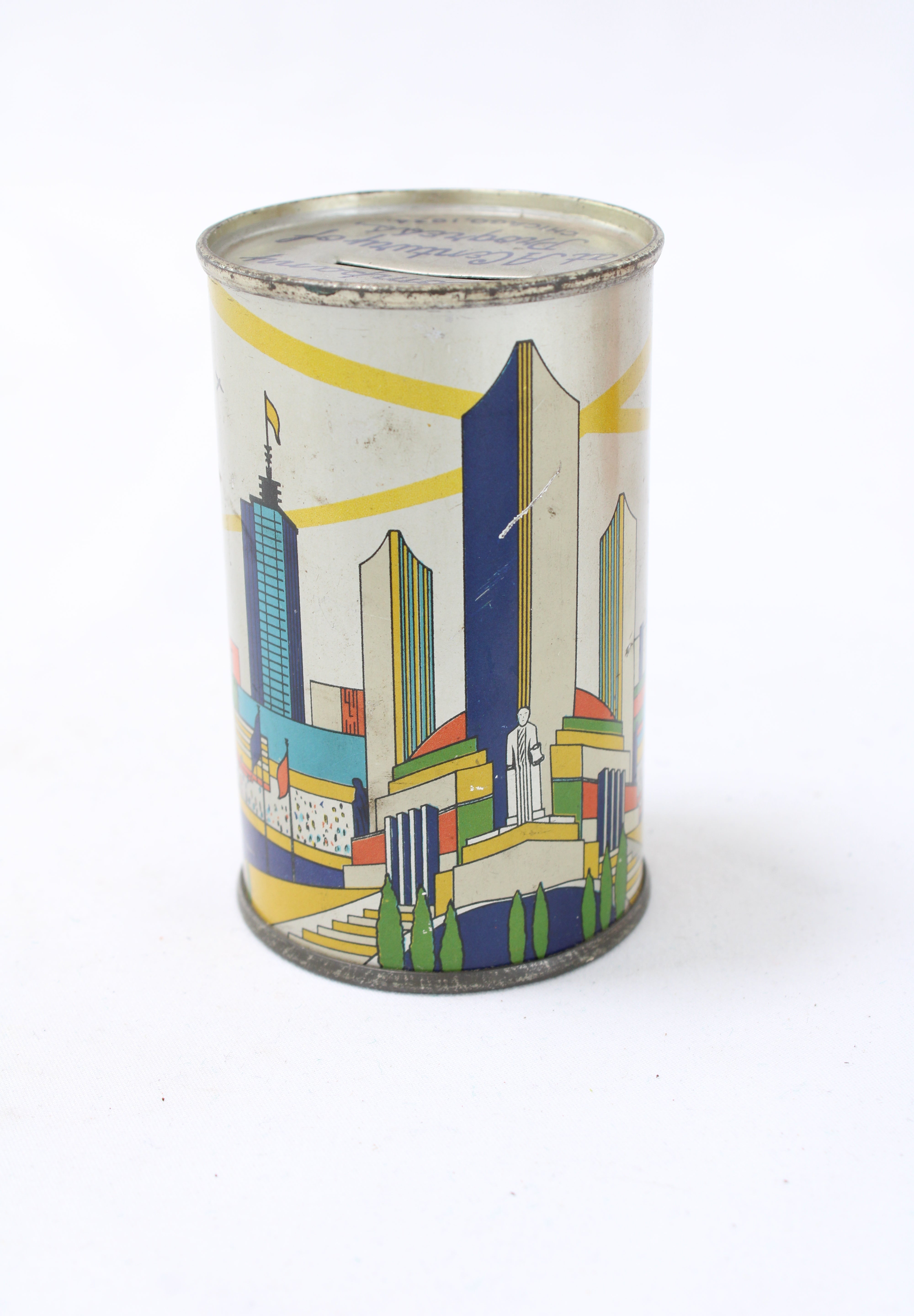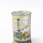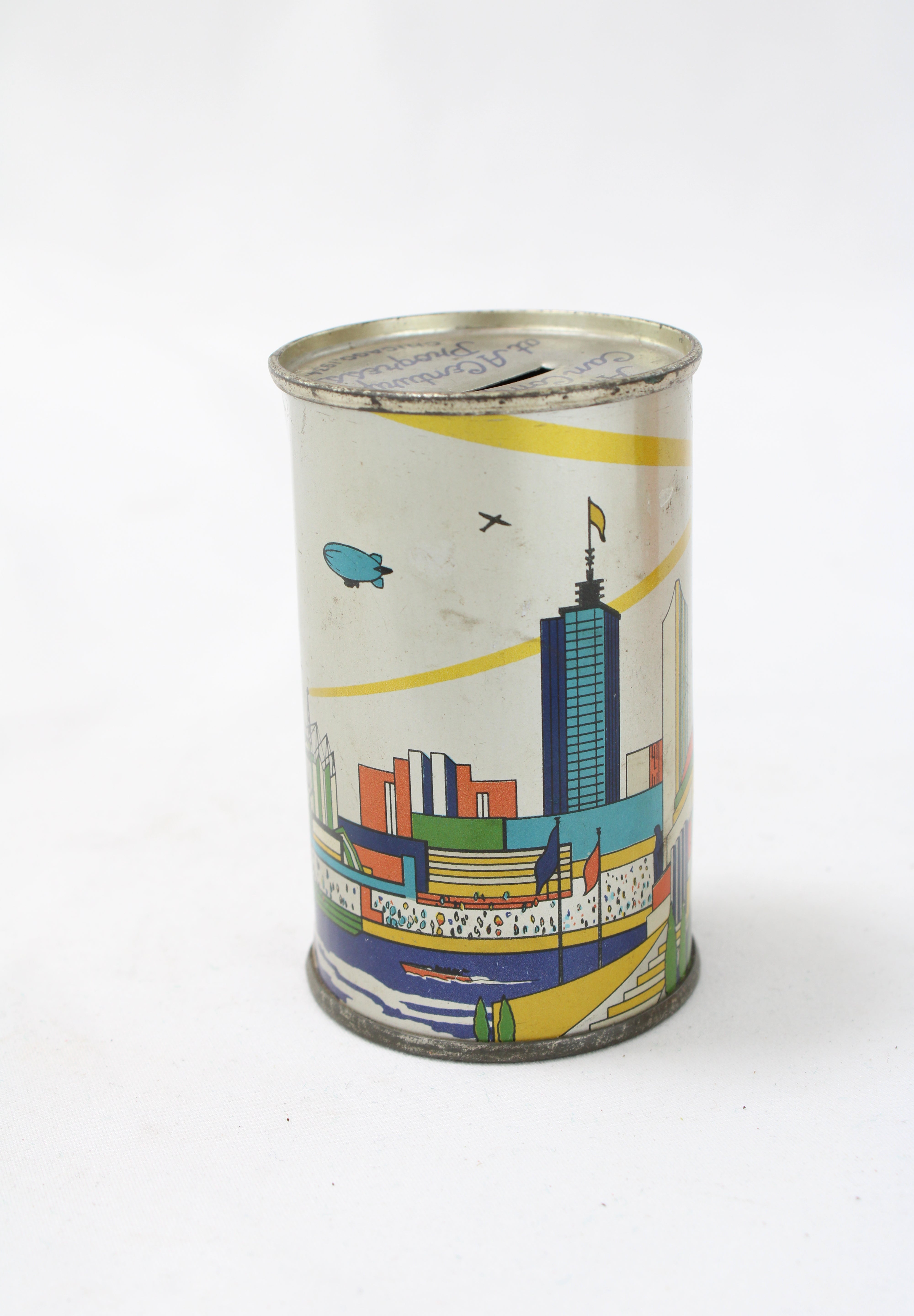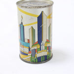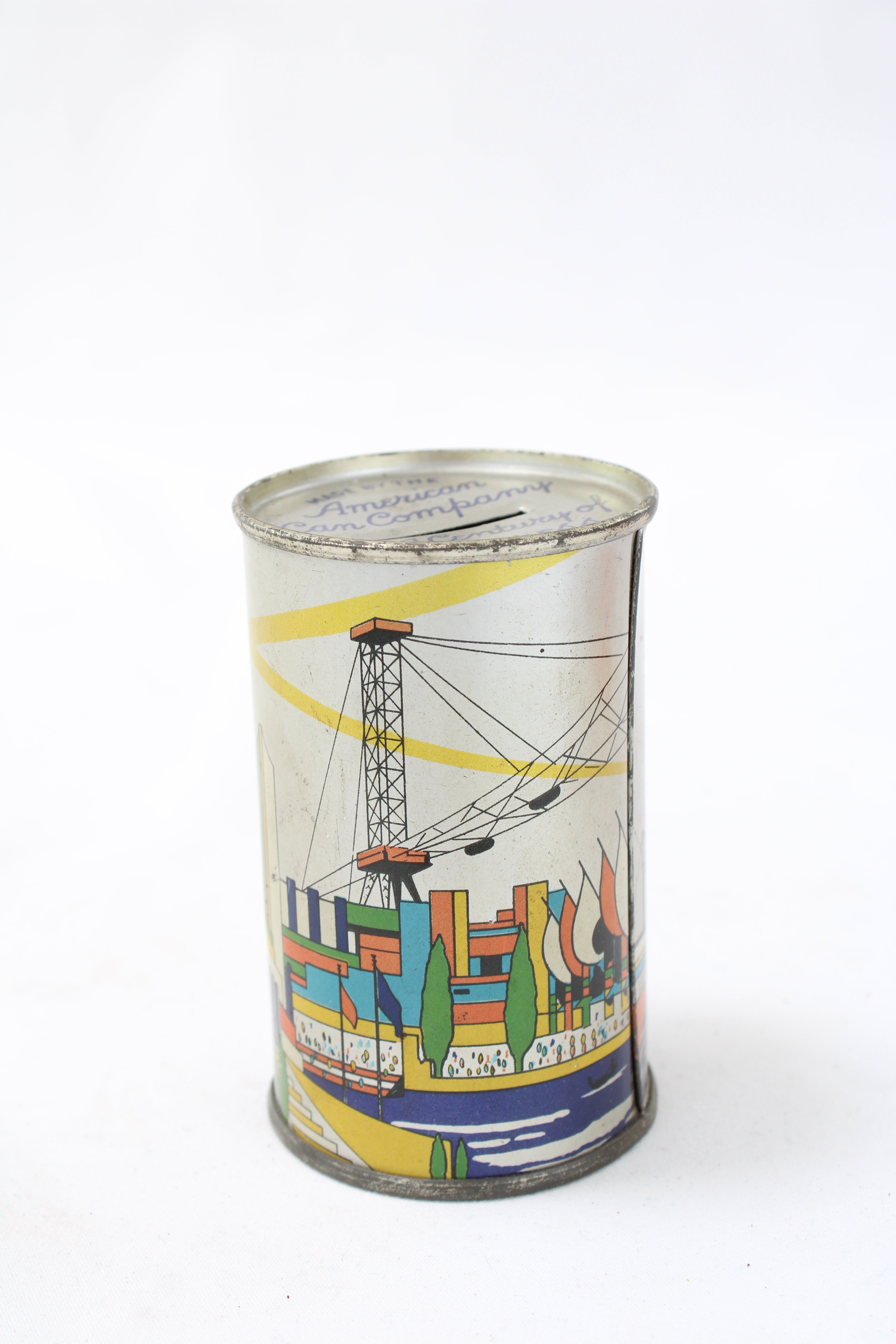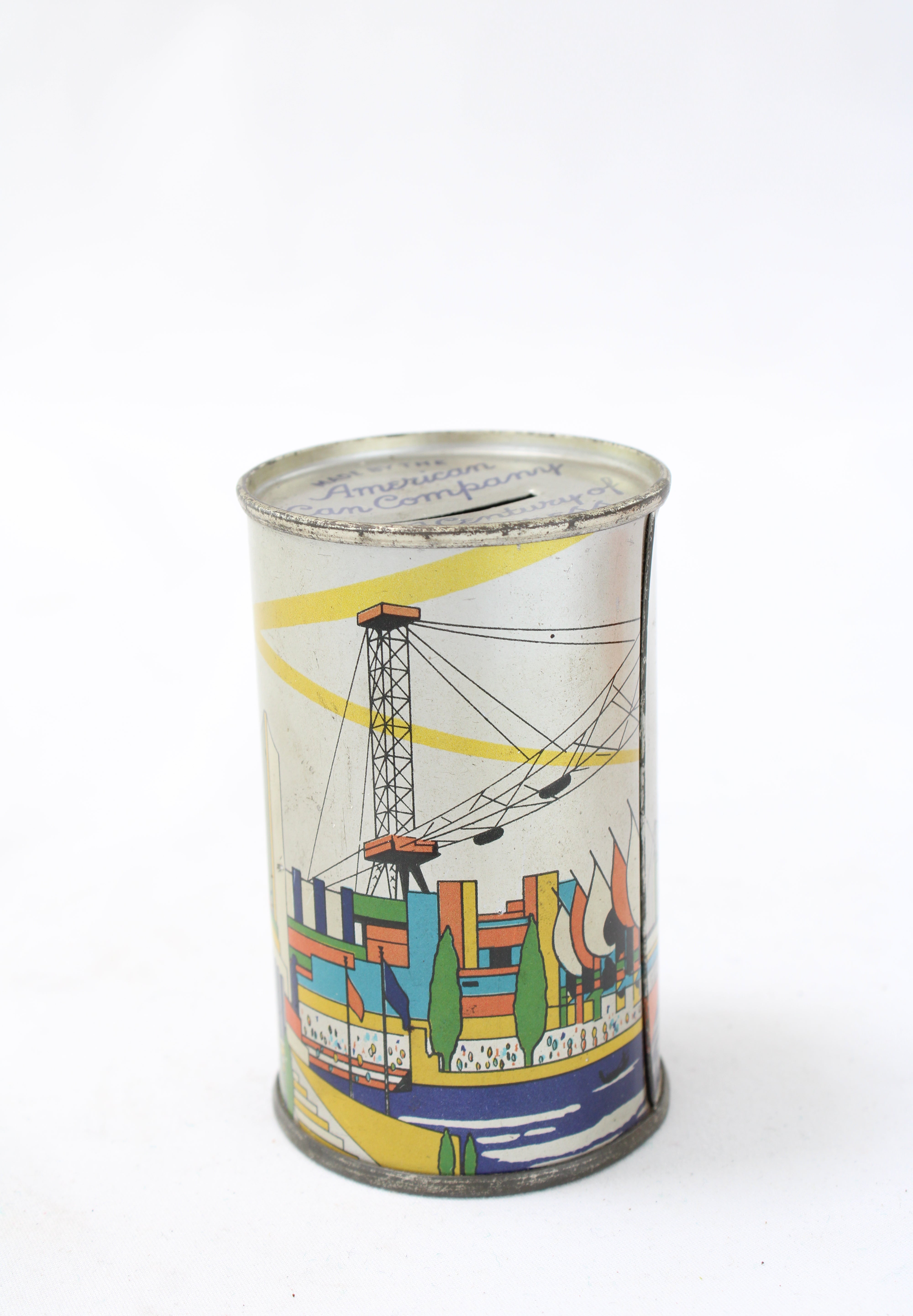 The American Can Century of Progress Bank was made for the 1934 Chicago World's Fair. The colorful graphics portray a modern city with tall buildings, blimps, airplanes, and a skytram. The 2" diameter and 3-1/2" tall can bank is in very good condition.