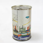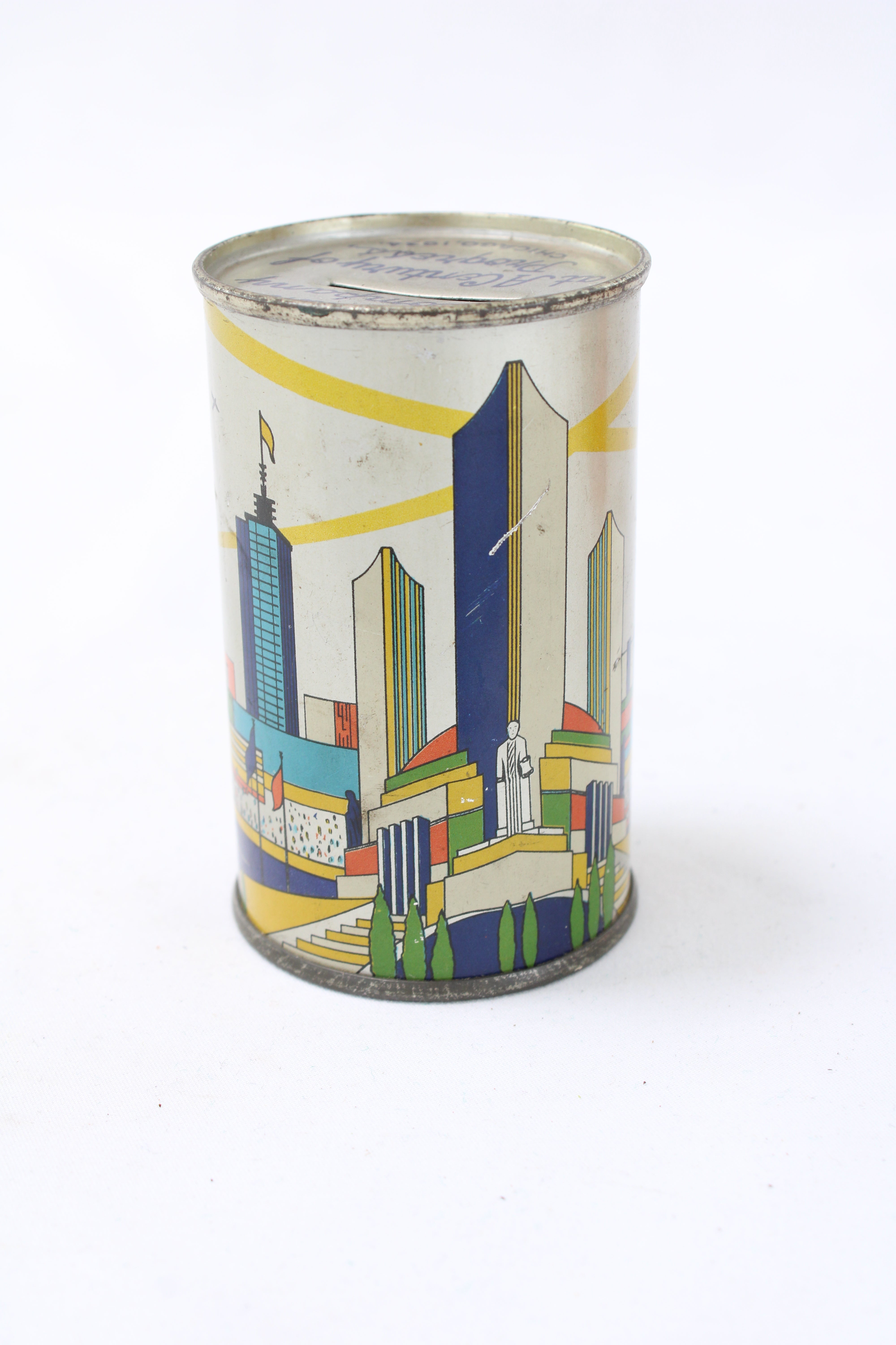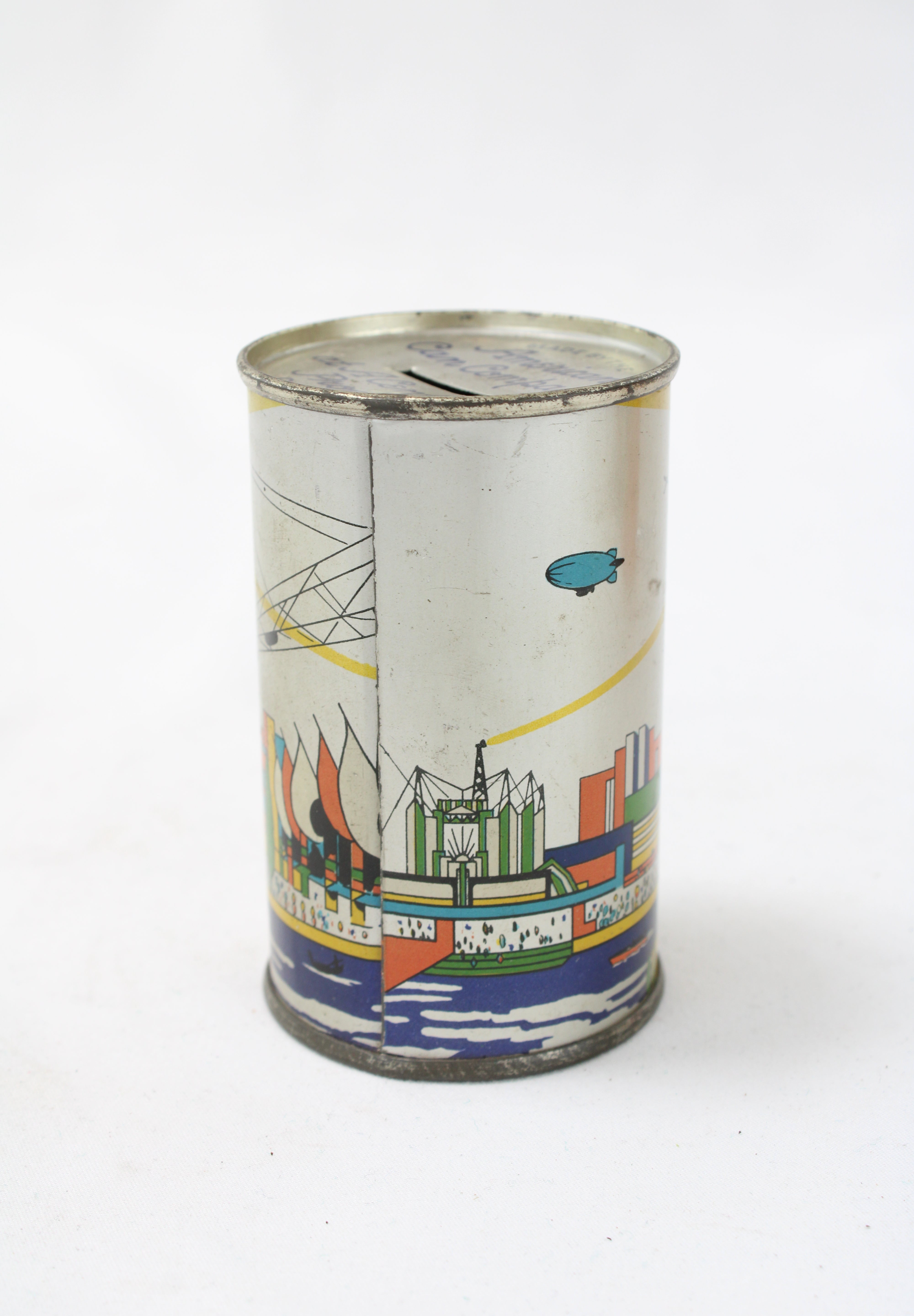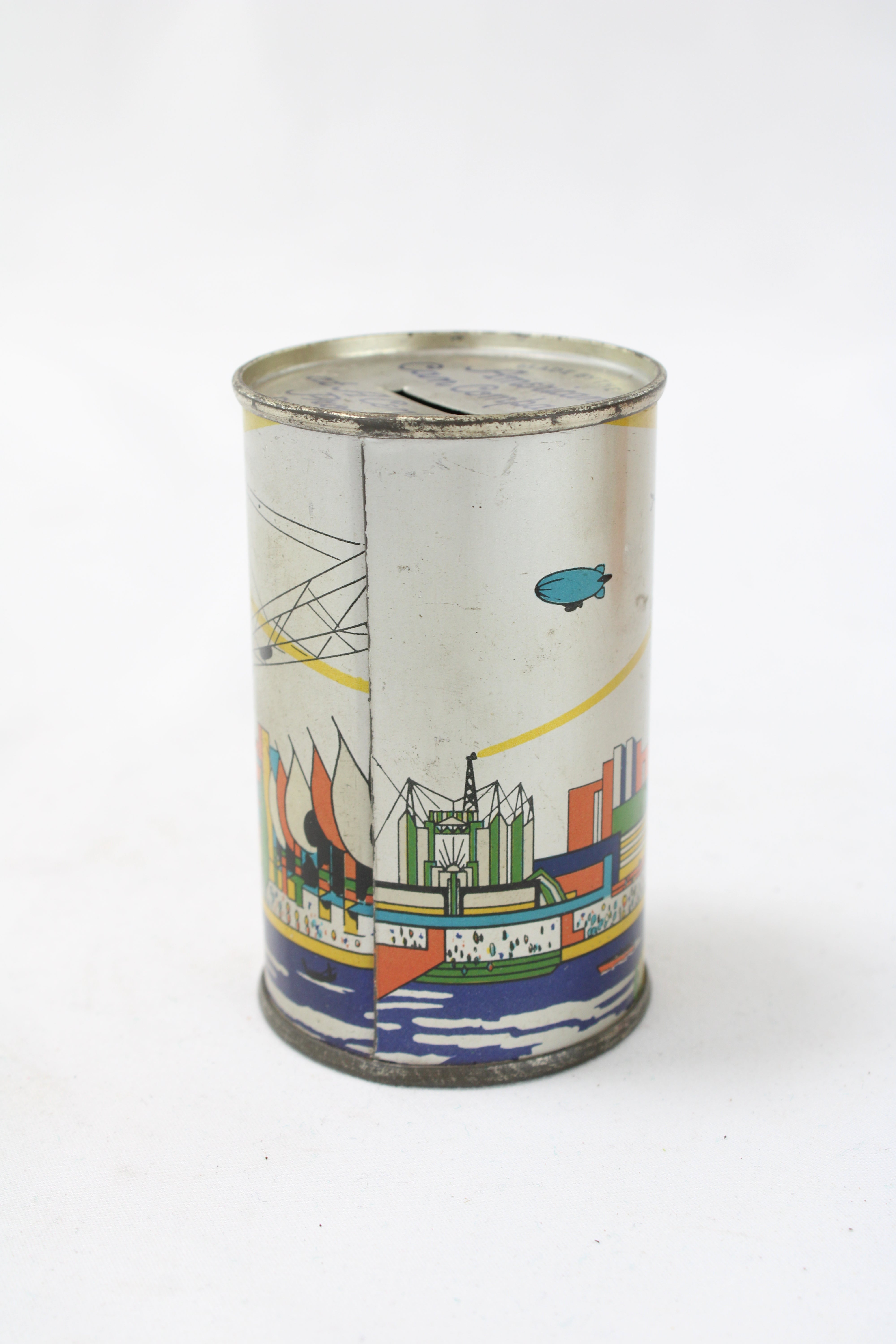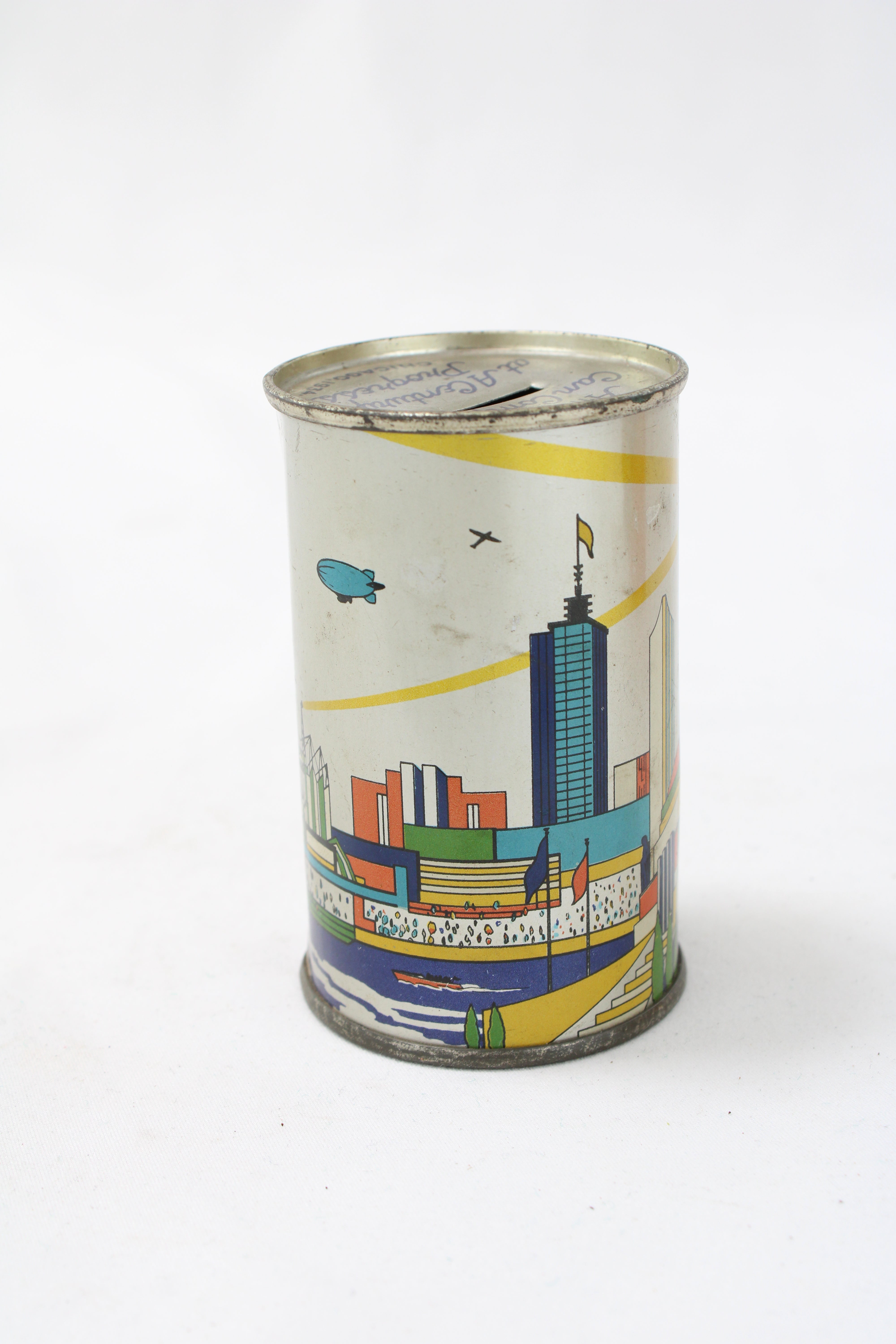 The American Can Century of Progress Bank was made for the 1934 Chicago World's Fair. The colorful graphics portray a modern city with tall buildings, blimps, airplanes, and a skytram. The 2" diameter and 3-1/2" tall can bank is in very good condition.