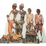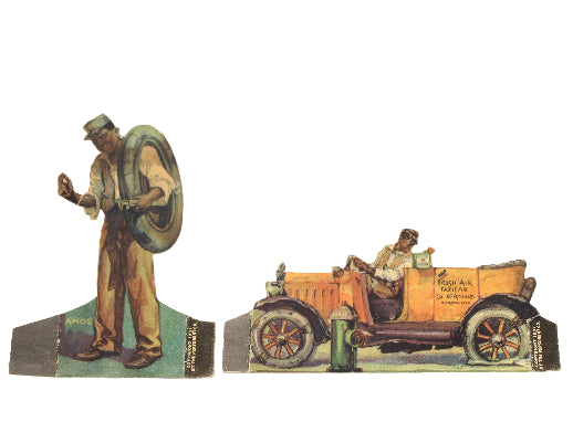 The are three smaller cutouts in very good condition from 1931 showing Bill Hay sitting at a desk talking into a microphone (3-3/4" tall), Amos holding a spare tire (4-3/4" tall), and Amos Jones in his open-air taxi (3" tall and 5" wide).
