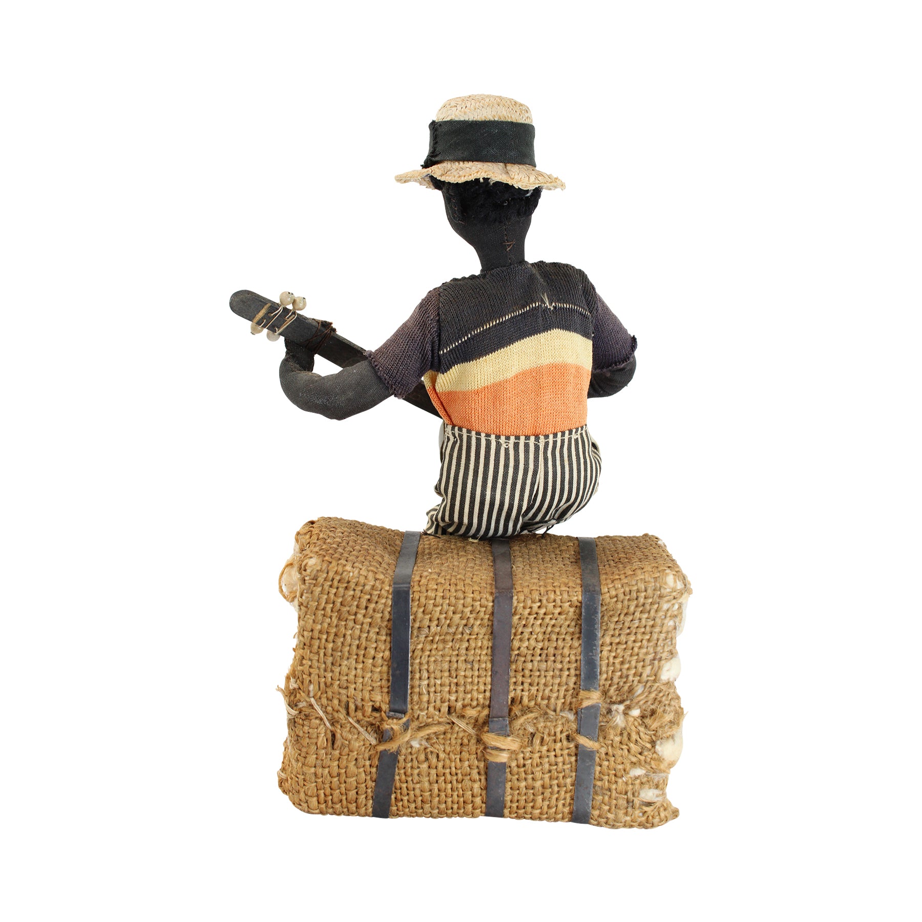 8" Tall Cloth Doll of a Banjo Playing Man Sitting on a Bale of Cotton