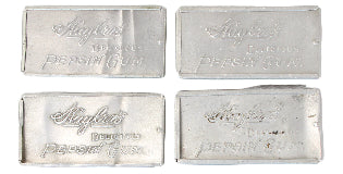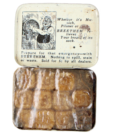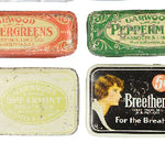 This lot includes four Huyler's pepsin gum aluminum tin packages with sliding lids, three Garwood metal aspirin size tins labeled peppermint, wintergreen, and spearmint, and lastly, an aspirin-like hinged tin from 1931 of Breethem Mints that still has the original mints and cover tissue inside.