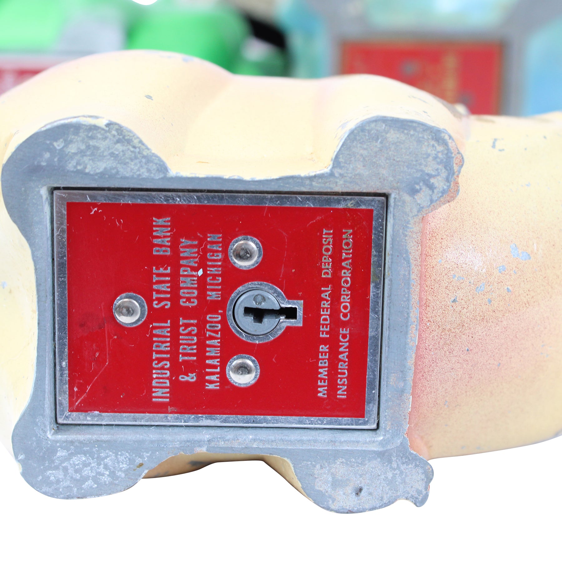 A Porky-like metal pig promotional bank marked "The State Bank of Cazenovia" (Wisconsin) leads the pack. This bank is 5-1/2" tall and displays well. The coin stopper is missing, but the condition of the metal, painted bowtie, eyes, and mouth remains in very good condition.