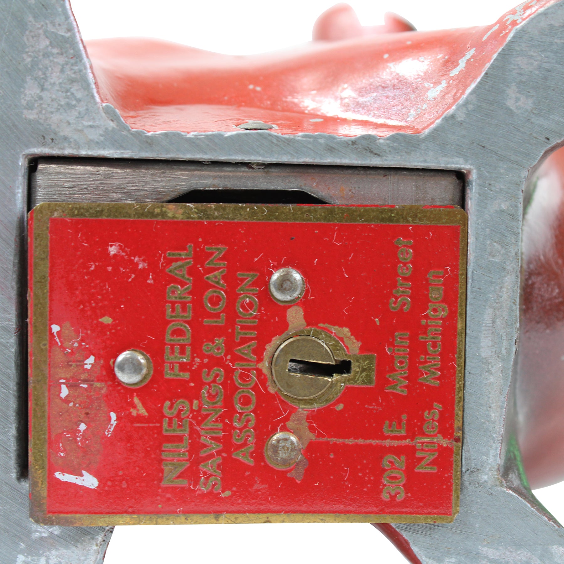 A bank with the name Niles Federal Savings & Loan Association (Niles, MI) is associated with the red 4-1/2" tall bank that is also in fair condition because of some paint loss.
