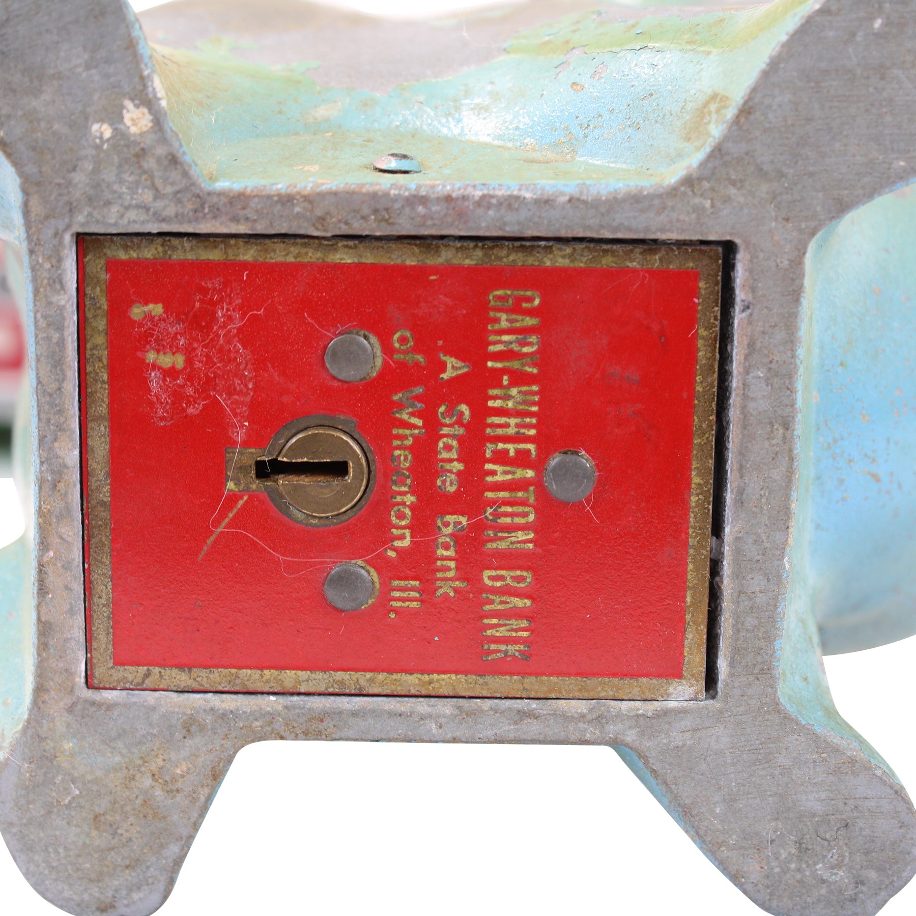 The four heavy ceramic promotional giveaway banks are as follows: A blue colored 4-1/2" long bank featuring Gary-Wheaton Bank (Wheaton, IL). This bank is in fair condition with excessive paint wear.