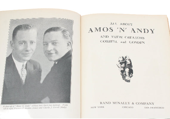 1930 book biography titled "All About Amos 'N' Andy and Their Creators Correll & Gosden." This 126 page hard cover book features pictures as the history of the comedy written by the show's creators is being told. The book was published by the Rand McNally Company. The book is in good condition with no pages missing but the hard orange cover does show some separation on the top of the binding.