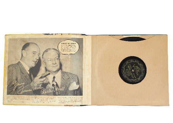 1947 Amos 'N' Andy 78 RPM album, a ten-record set but only one record is in the album set. The hard album cover features pictures, narrative and information relating to the album set that was distributed by Monitor Appliances. The record that is in the set is titled "Is Everybody in Your Family as Dumb As You Is." The album cover and record sleeves are in good condition.