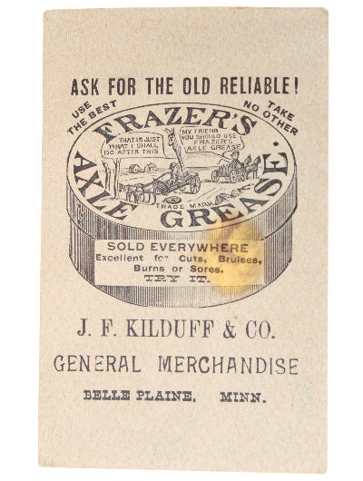 Frazer’s Axle Grease was a well-known brand during the late 1800s, heavily promoted through colorful lithographed trade cards distributed by general stores and hardware dealers.