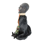 Tiny nails were used to accent the decorative ears. The silk, linen, and burlap clothing has substantial wear and thread loss, but the black linen cloth that covers the operator's moving hand remains in good condition.