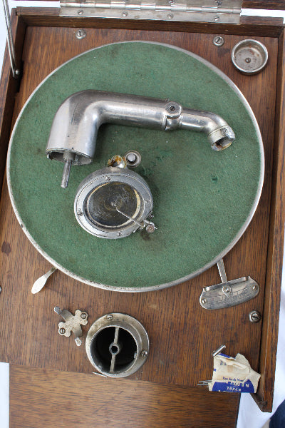 The interesting oak case contains a 1920's Cecilian hand crank phonograph that doesn't work due to a cracked metal playing arm and a wind-up crank that does not seem to want to wind anything.