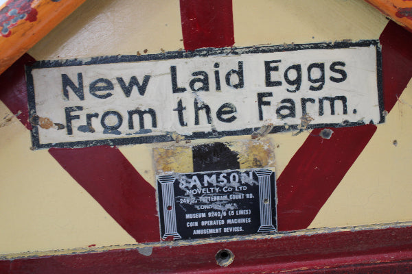 The machine is labeled with the words "New Laid Eggs From The Farm." The last machine we saw like this sold for over $3,500 about ten years ago. We tested the crank after placing a 6-pence coin in the coin slot (we will give the buyer the 6-pence coin), and the mechanism seemed to be working.