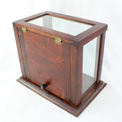 The back of the case has a hinged wooden door that opens to access the inside of the case. The antique glass panels are in excellent condition, as is the well-built stained hardwood frame.