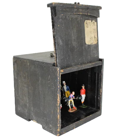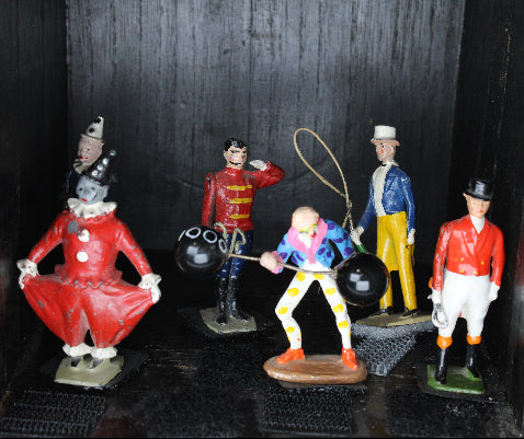 Circus Folk Art - 6 Circus Lead Figures (England) Inside a Sliding Panel Antique Wood Box