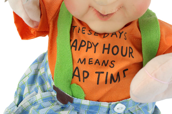 The old man has suspenders, plaid overalls, glasses, and a newspaper in his hand. He is wearing an orange shirt that reads "These Days Happy Hour Means Nap Time."