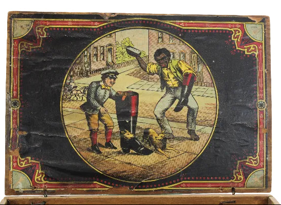 The box was designed to hold three dozen tins of Mason's black shoe polish. The inside of the lid features the famous-colored illustration of a Black man polishing a pair of large boots, with a dog and a white-uniformed boy watching. The dog's reflection is also shown on the newly polished boot placed on the sidewalk. The bottom front panel of the box also has a black and white illustration of the picture under the lid.