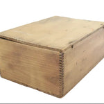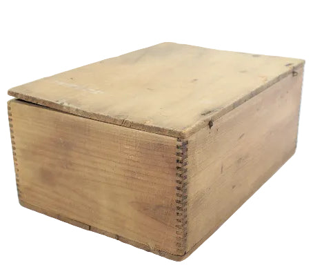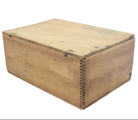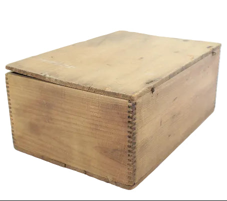 The wood box is in very good condition, with a crack on the bottom board and the lid being somewhat warped. The original wire top hinges are present, and the dovetail corner construction relating to the assembly of the box is noticeable.