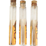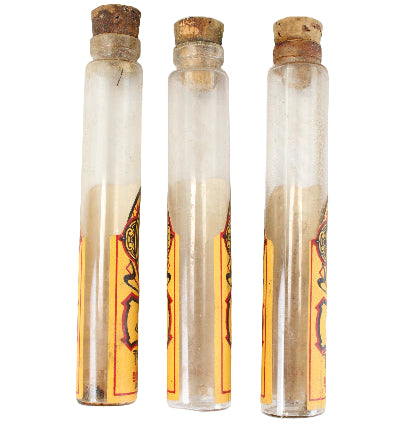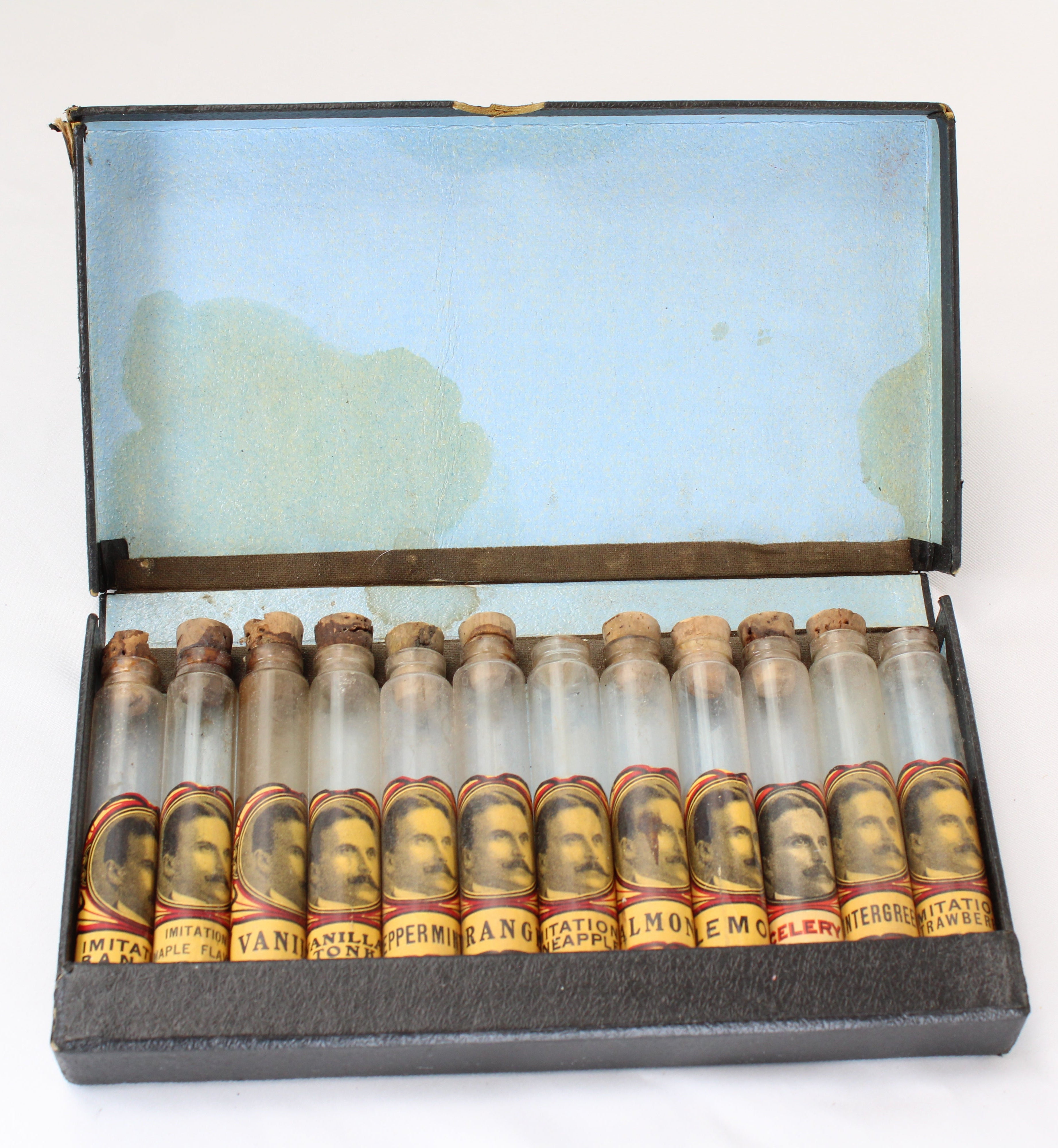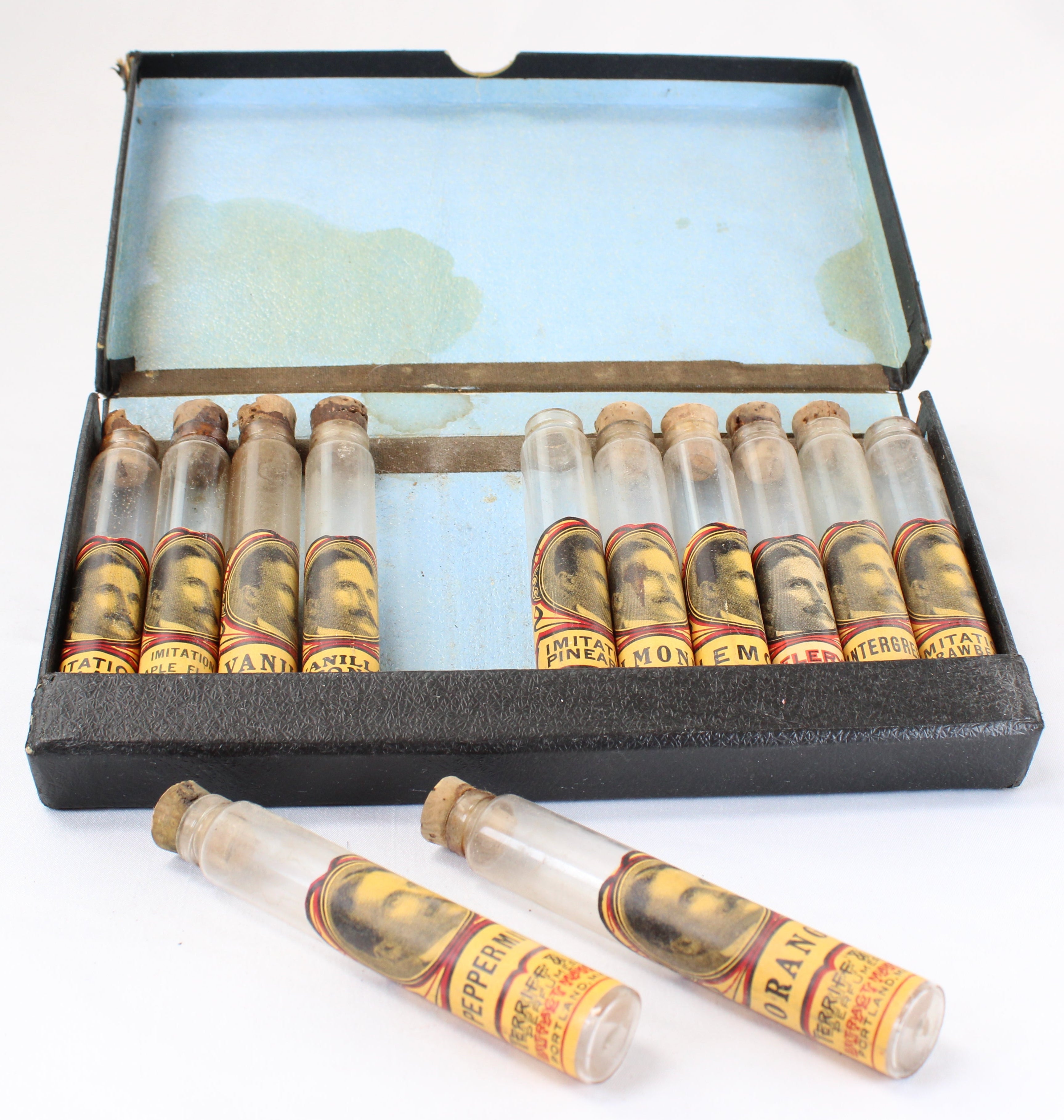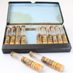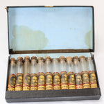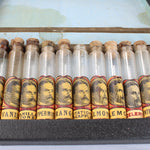 This salesman's sample case includes twelve empty glass cylinder vials (ten with corks) with product labels that are in excellent condition.