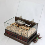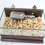The display is 14-1/4" in width, 7-1/2" in height, and 9" in depth. There is an antique hinged glass top that lifts and covers a metal tray where the nuts are held.