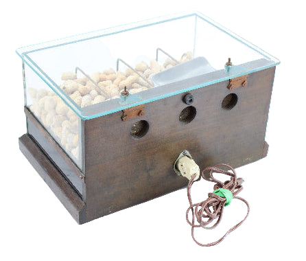 Under the tray is a light bulb that keeps the metal tray and nuts hot while lighting the colored glass pane that reads "They're Fresh" in bright red letters. There are three back vents in the display to prevent the nuts from getting too hot.