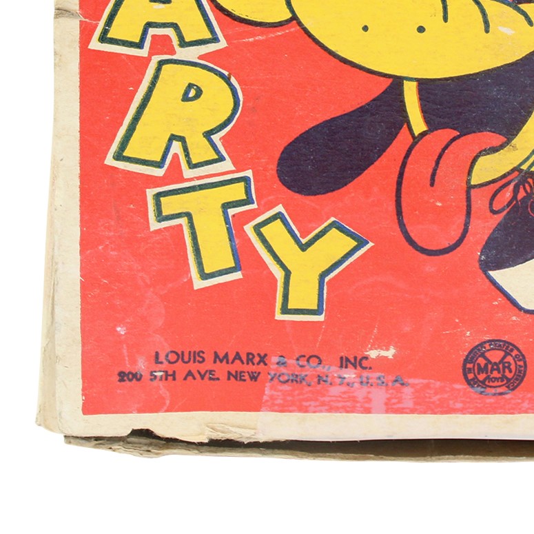 The original box has no top flap and has substantial tears and creases near the top and side seams. Some taping is present on the box. The graphics relating to the Pluto character do show on the box, and the valuable Louis Marx branding is also present.