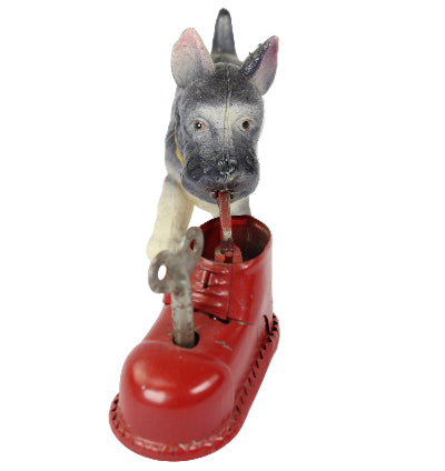 Early 1950's Wind-Up Celluloid "Scottie Dog Chewing Tin-Litho Shoe"