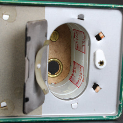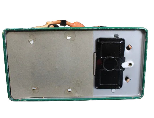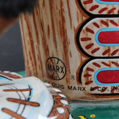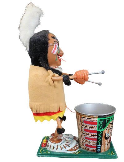 The Indian and tin is in very good condition but the drum is missing its imitation hide drum head. As with so many Japanese toys from the 1950's-1960's, inserting new batteries into this fun Indian did not get this toy to turn on so there was no drum beat, tongue movement, body movement or war whoop heard.