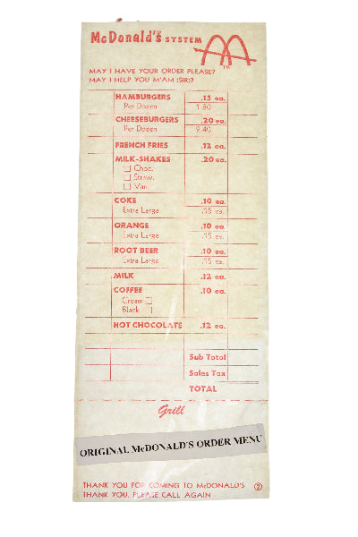 This wonderfully preserved unused order slip settles the question of how much was the original price of McDonald's food items was when they started in business.