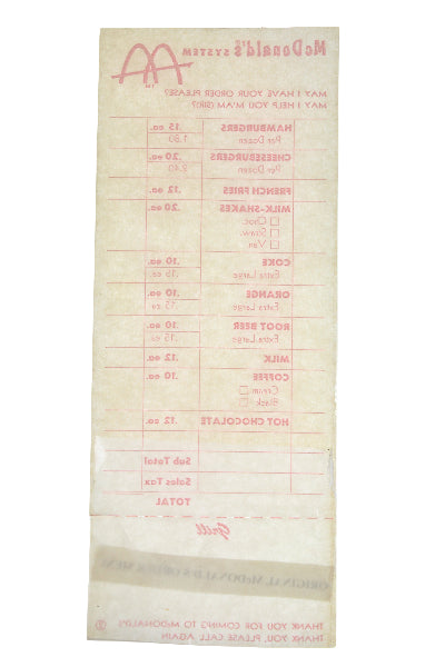 Early 1960's McDonald's Lunch / Dinner Counter Order Slip