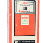 This vintage Sinclair promotional transistor radio, designed to resemble the classic “Dino Supreme” gas pump, is a highly collectible piece of 1960s Americana.