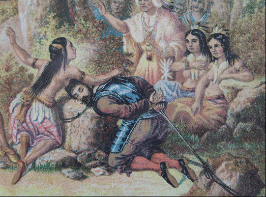 The label features the illustrated Jamestown scene from 1607, where Pocahontas placed her own head on John Smith's body to prevent her father from clubbing him to death. Pocahontas eventually married a tobacco grower by the name of John Rolfe, and consequently, the Pocahontas Tobacco Company recognized the special pedigree that the name suggests.