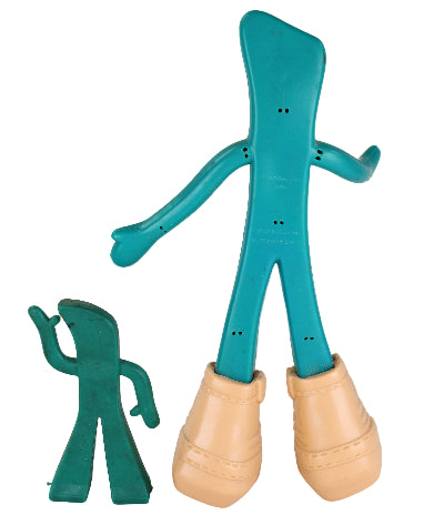 The 6" Gumby features the rare removable plastic boots. The two small 2-1/2" tall red Gumby's riding the horses are wearing cowboy hats and are riding miniature blue horses named Pokey.