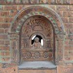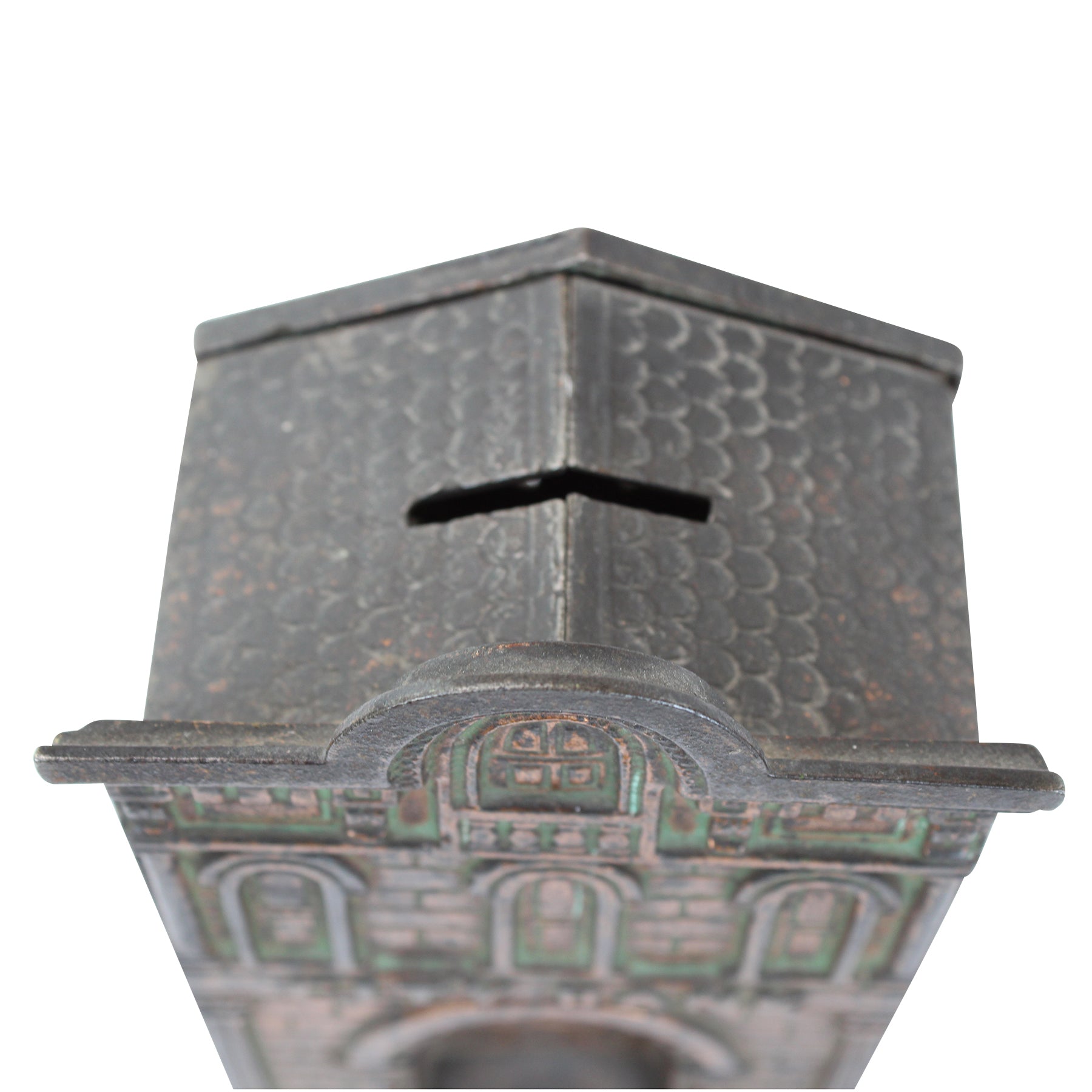 The bank measures 5-1/4" tall at the top of the round building facade, 2-1/8" in depth and 3-1/8" in width. The bank was manufactured around 1900.