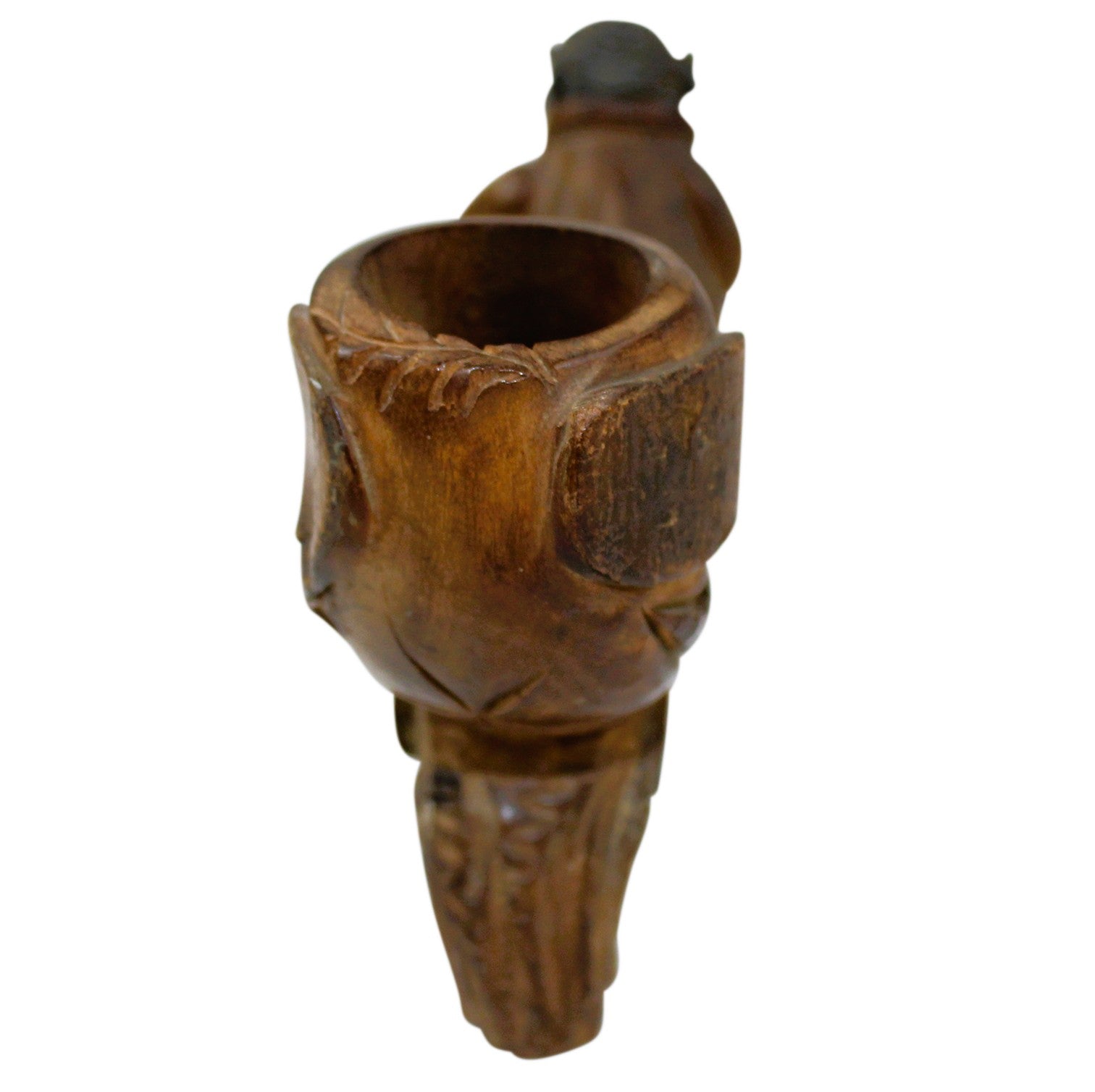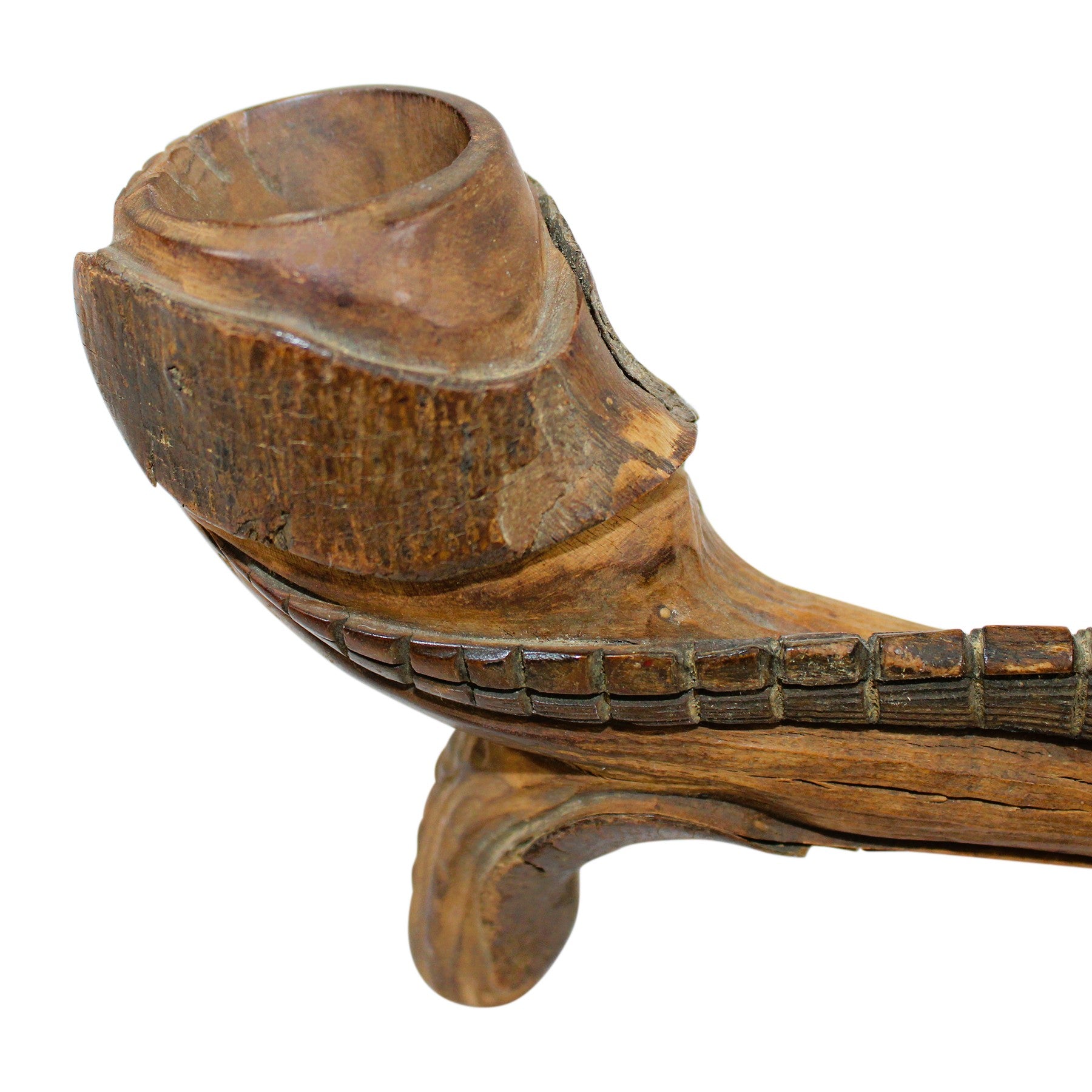 A unique wooden leg beneath the bowl allows for comfortable, one-handed use, while the intricate carving of a black man, bowl, and alligator reflects the woodworker’s remarkable skill and artistry. Remarkably, the pipe shows no signs of ever having been smoked, preserving its pristine condition and collectible value.