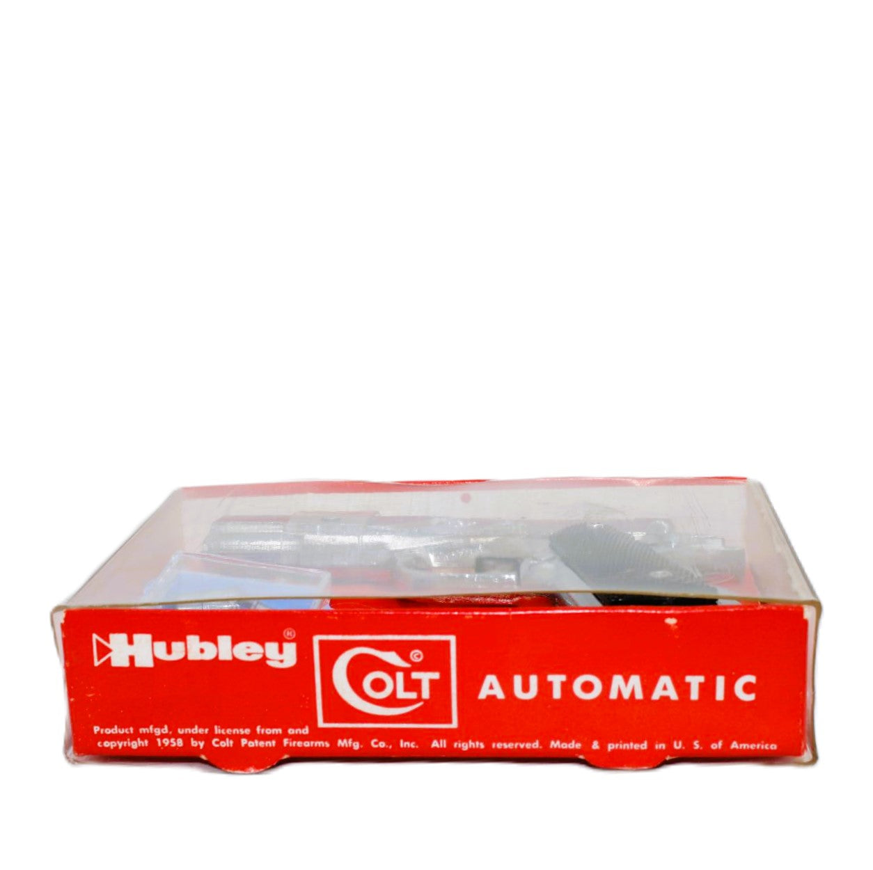 This toy gun is near mint and the six bullets have never been used. The gun was made in 1958 and the loading of play bullets into the clip and inserting and ejection of the clip was unique to most cap guns of the day. The box is in wonderful shape with some minor marring on the clear plastic.