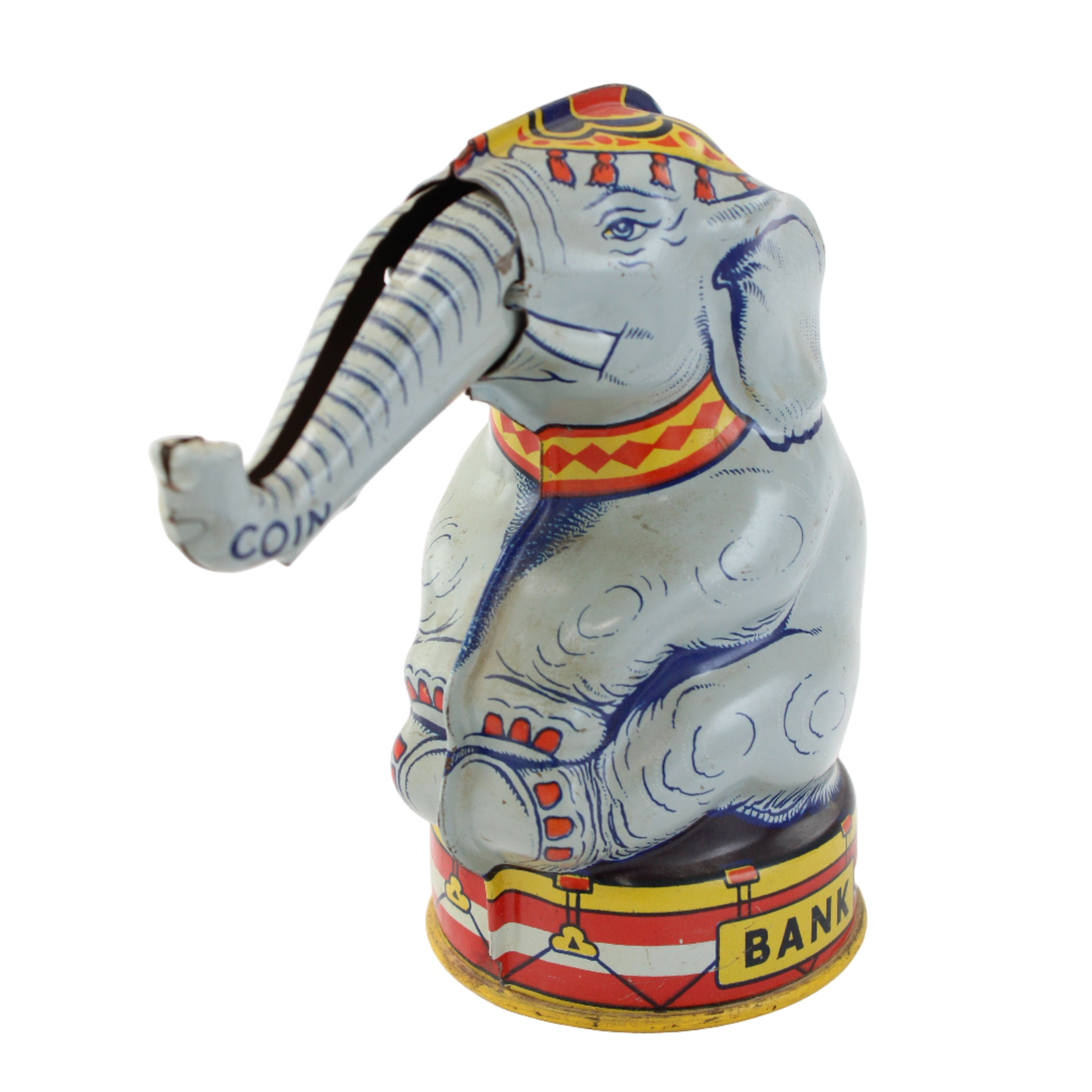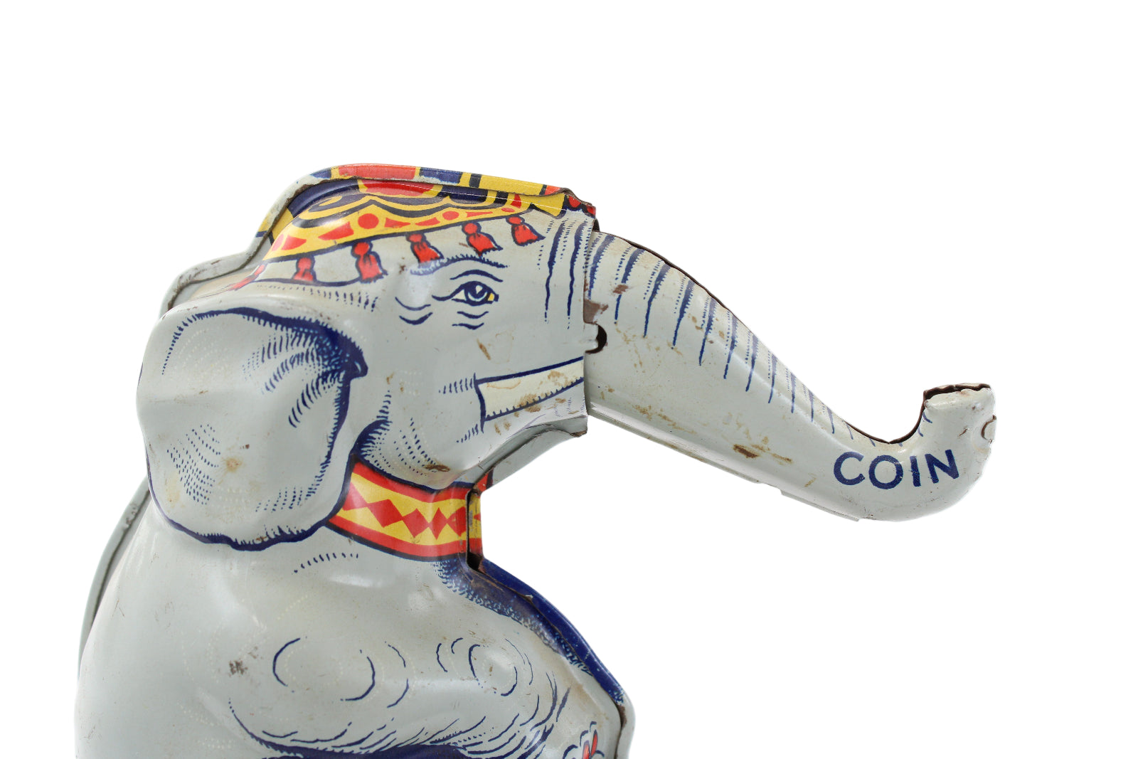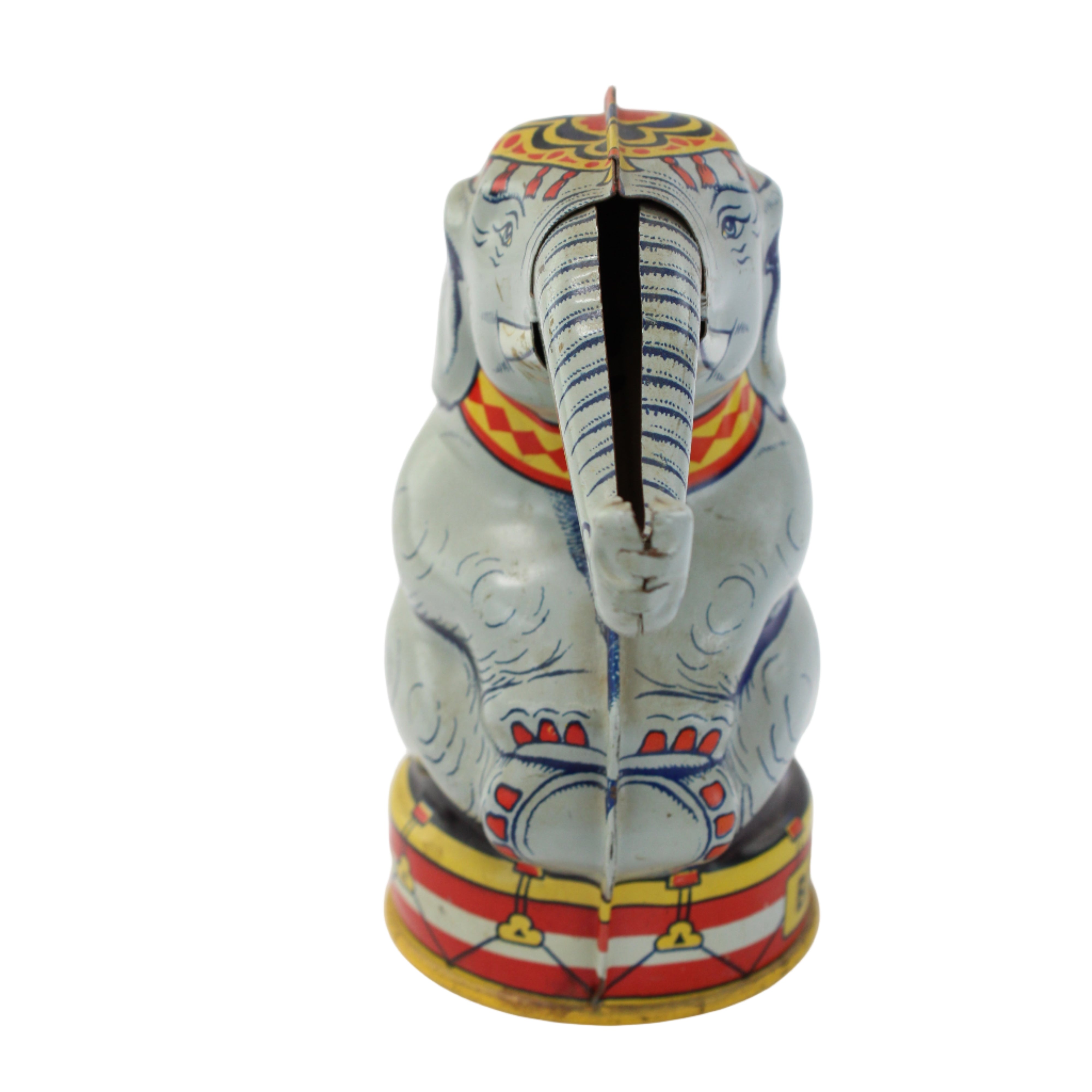 The trunk lifts up to deposit the coin in the head of the elephant. This bank is in very good condition, with all paint and markings present, and the original stopper is present as well.