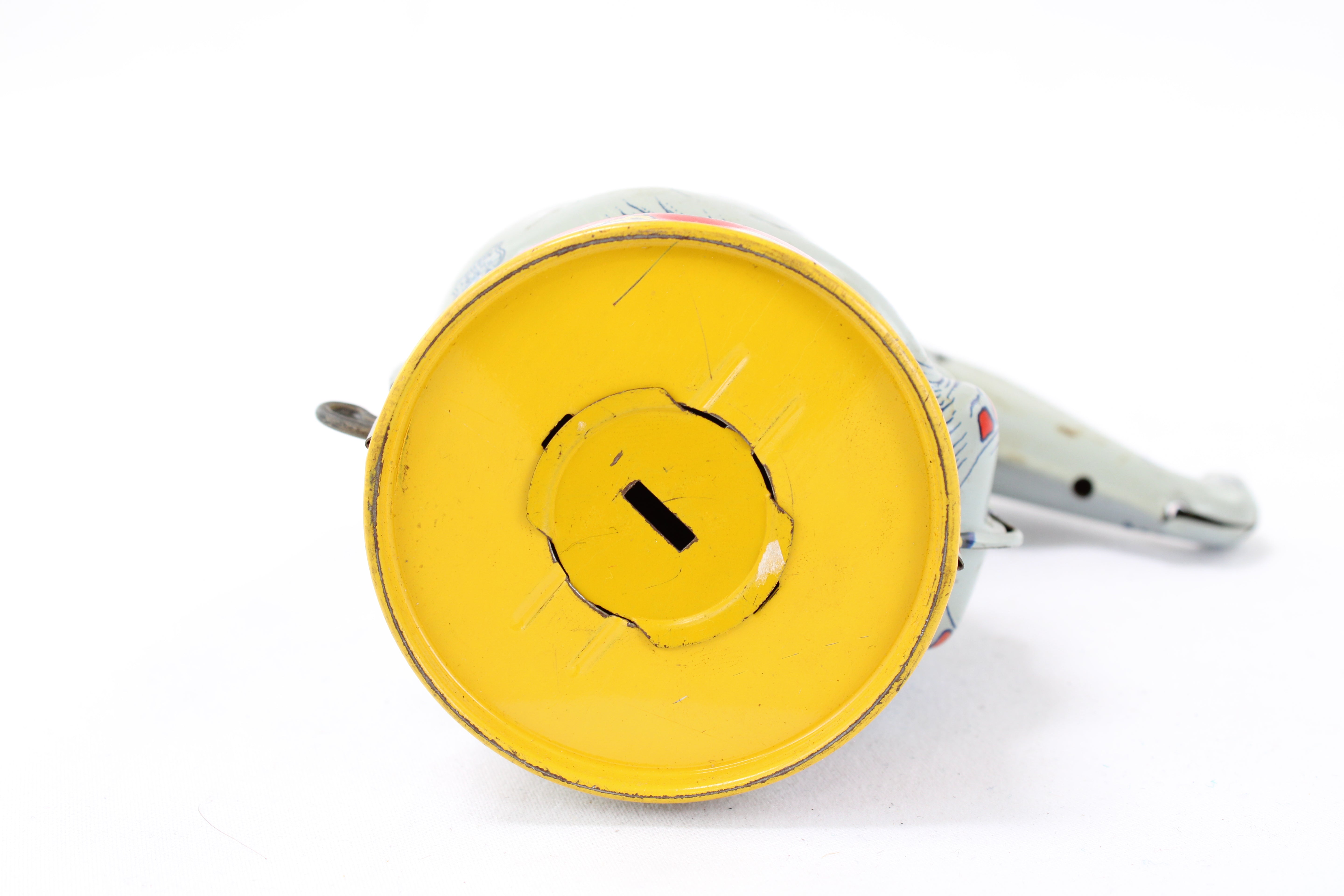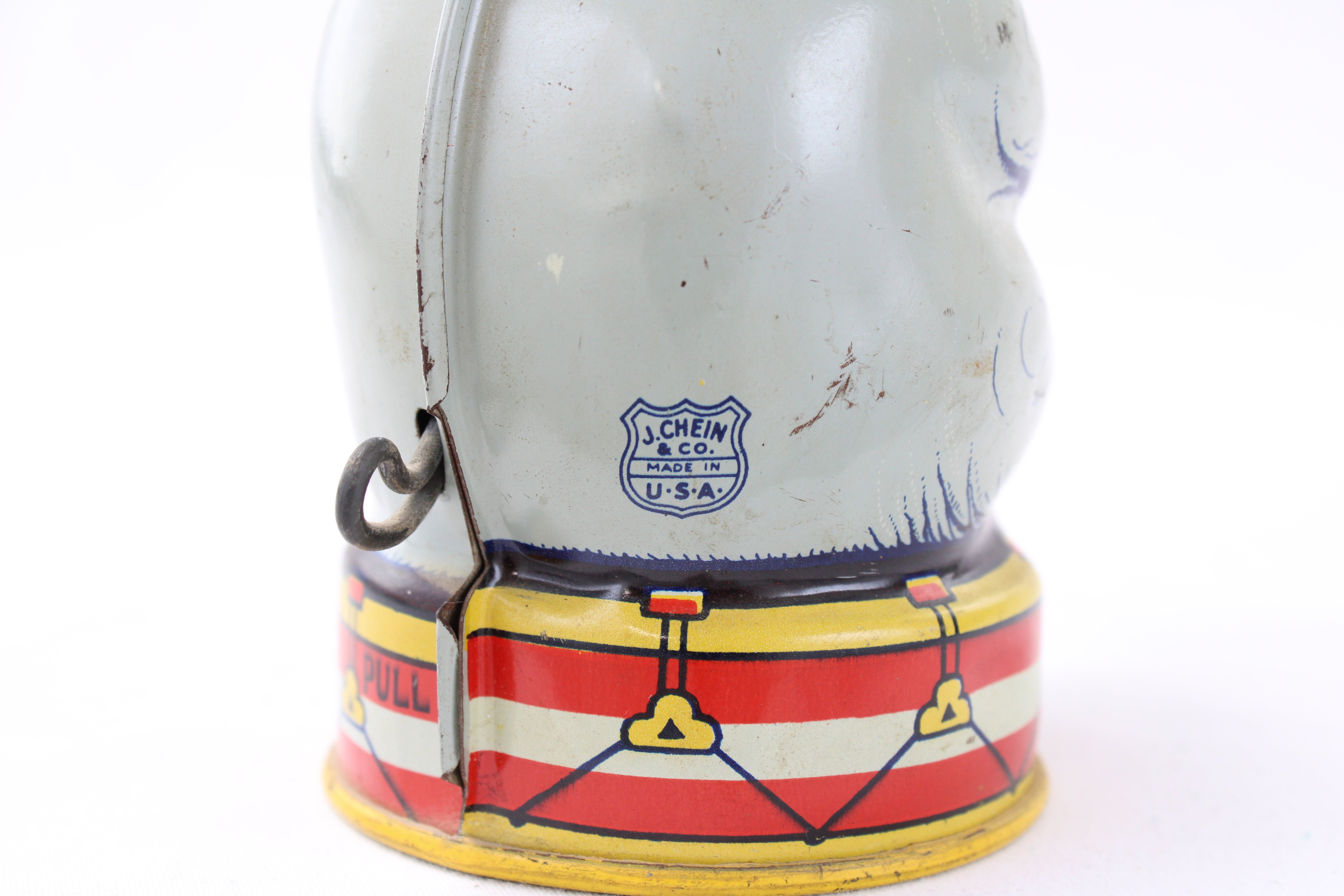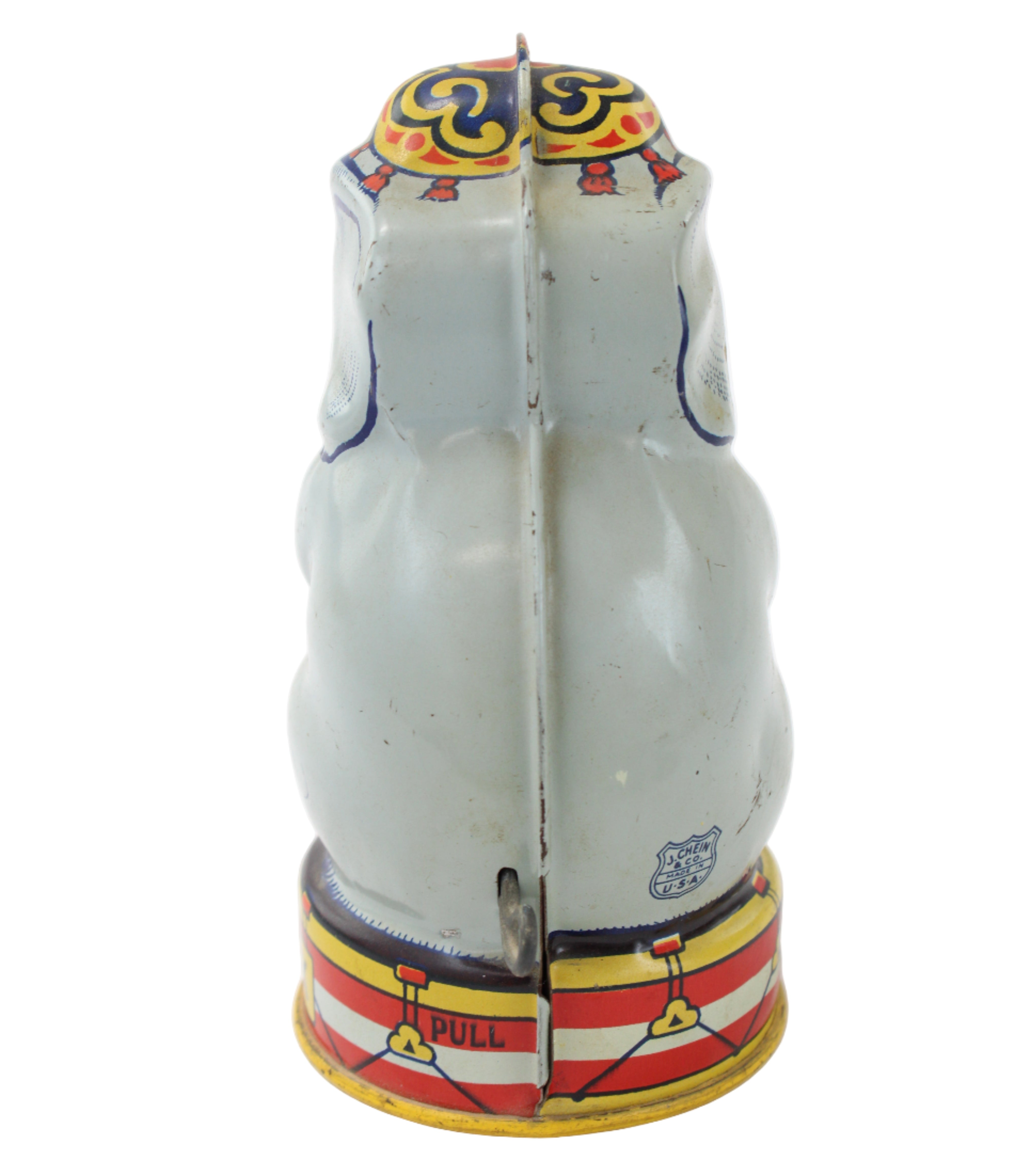 The trunk lifts up to deposit the coin in the head of the elephant. This bank is in very good condition, with all paint and markings present, and the original stopper is present as well.
