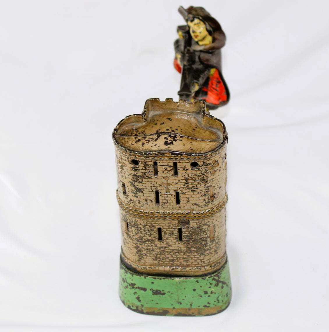 This J. & E. Stevens 1896 William Tell Cast Iron Mechanical Bank is in its original condition and the bank works perfectly. The bank retains most of its original paint, and all parts, including the arm that raises the apple on the target that operates as intended.