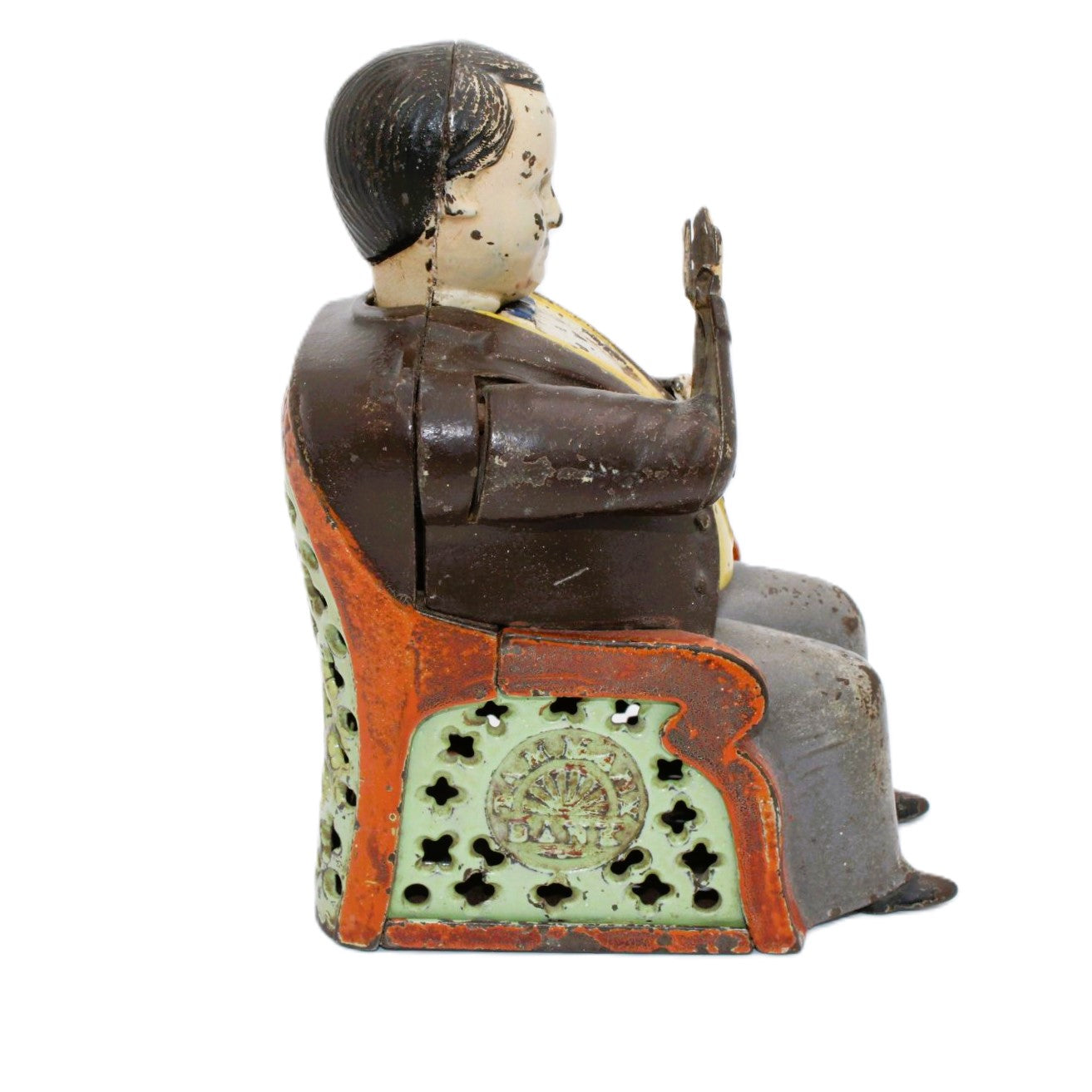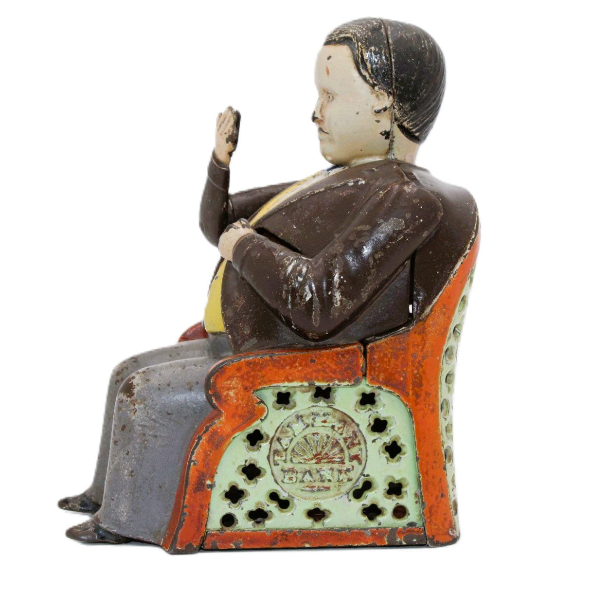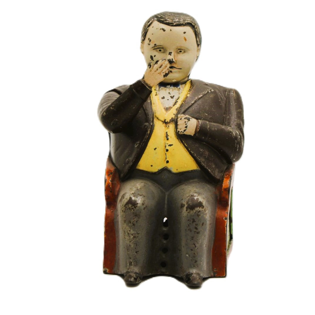 Tammany Hall was the seat of the powerful Democratic Party when the bank was manufactured by J. E. Stevens. Every time you place a coin in the hand of the sitting politician, he nods his head in appreciation as he deposits the coin into the slot. Tammany Hall became associated with corruption in the 1870’s. In 1873 John Hall patented a bank design that was called “The Little Fat Man Bank” and this bank was subsequently renamed the “Tammany Bank” by J. E. Stevens, the bank’s manufacturer.
