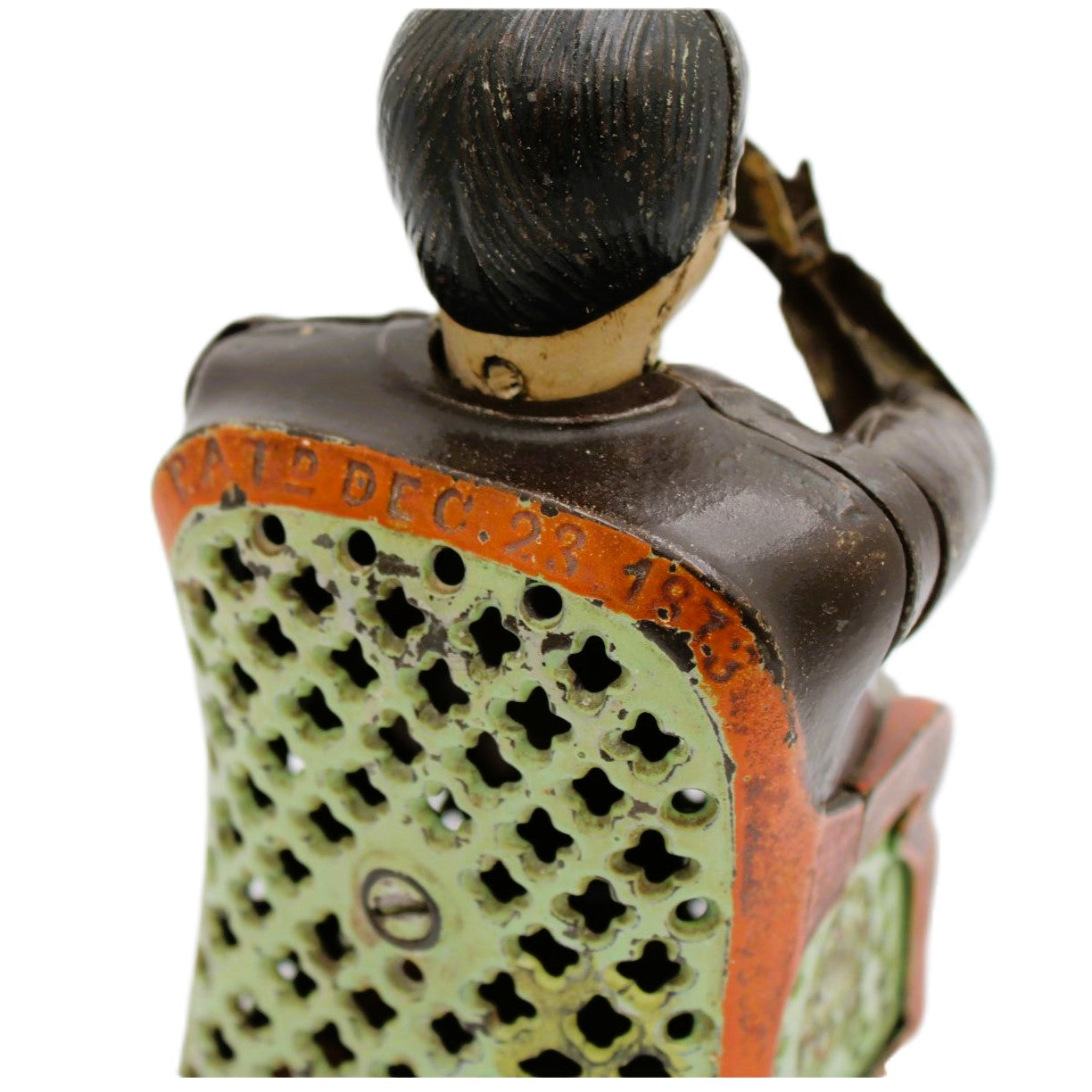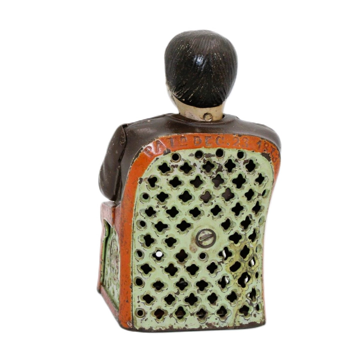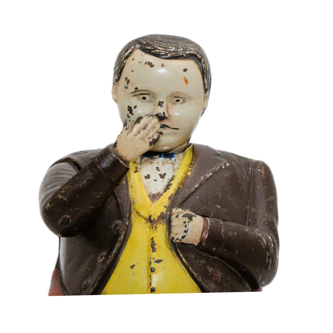 Tammany Hall was the seat of the powerful Democratic Party when the bank was manufactured by J. E. Stevens. Every time you place a coin in the hand of the sitting politician, he nods his head in appreciation as he deposits the coin into the slot. Tammany Hall became associated with corruption in the 1870’s. In 1873 John Hall patented a bank design that was called “The Little Fat Man Bank” and this bank was subsequently renamed the “Tammany Bank” by J. E. Stevens, the bank’s manufacturer.