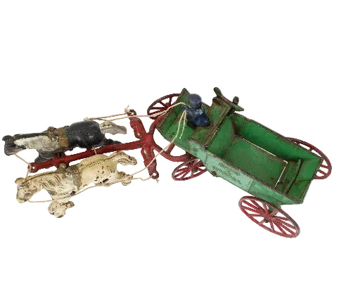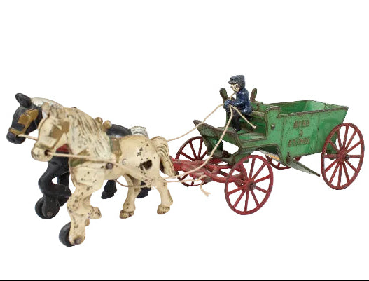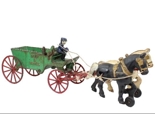 This very good condition cast iron sand and gravel wagon with a latch release bottom dumping slide, driver and two horses is ready for display.