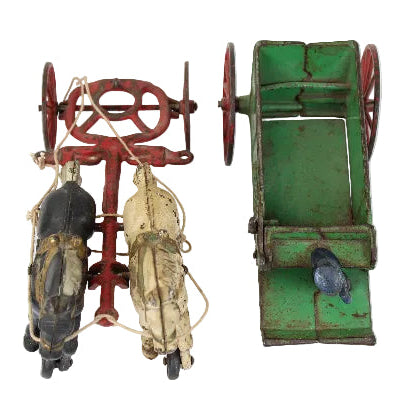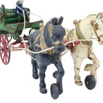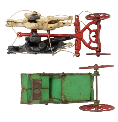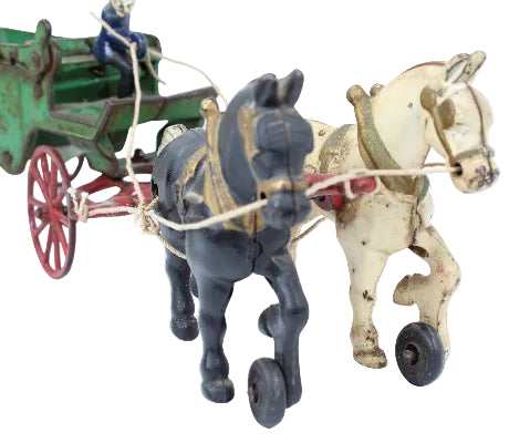 All the original cast iron parts and wheels are fully functioning. The piece does show normal oxidation and wear but all the original paint colors are present and the painted details on the horses show well. The piece could easily be restored to an almost new condition but we like the graceful aging that a piece like this has experienced.