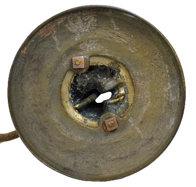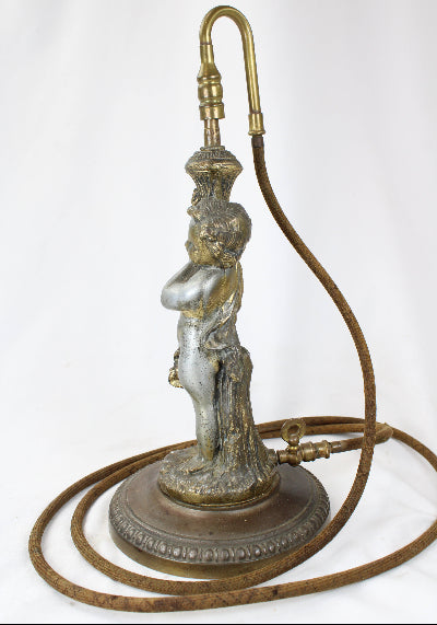 The lighter provided a continuous flame using a gas line connection, usually plumbed off the gas light connections. The condition of the metal and figurine is excellent. This rare piece has the original gas connection hose with a brass fitting.