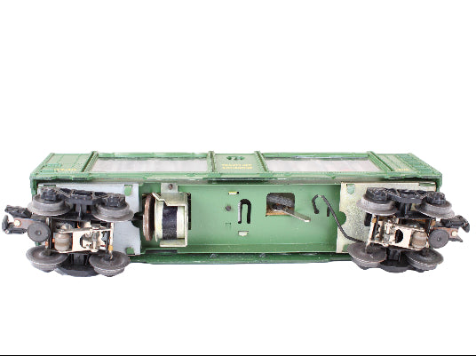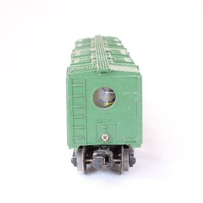 This very good condition aquarium train car was likely made in the late 1950's to 1962. The green painted train car shell with yellow lettering has two clear wave-like aquarium windows illuminating a display of ocean and fish scenes that are printed on a continuous feed plastic film.