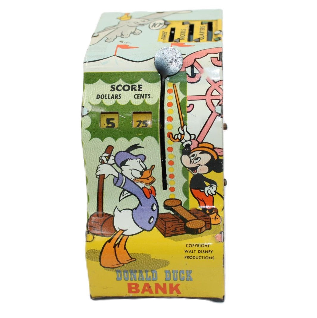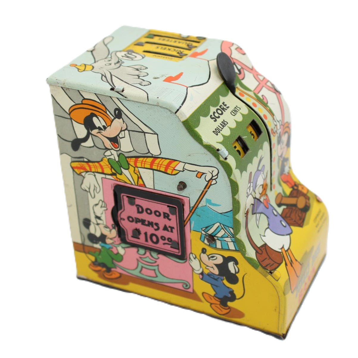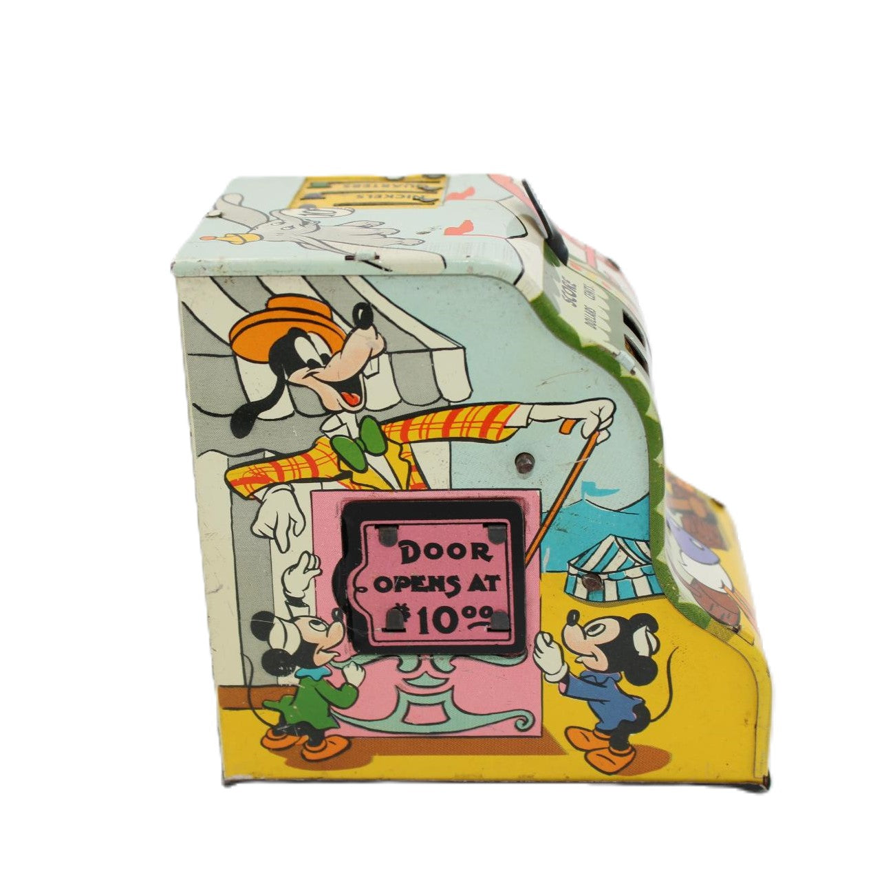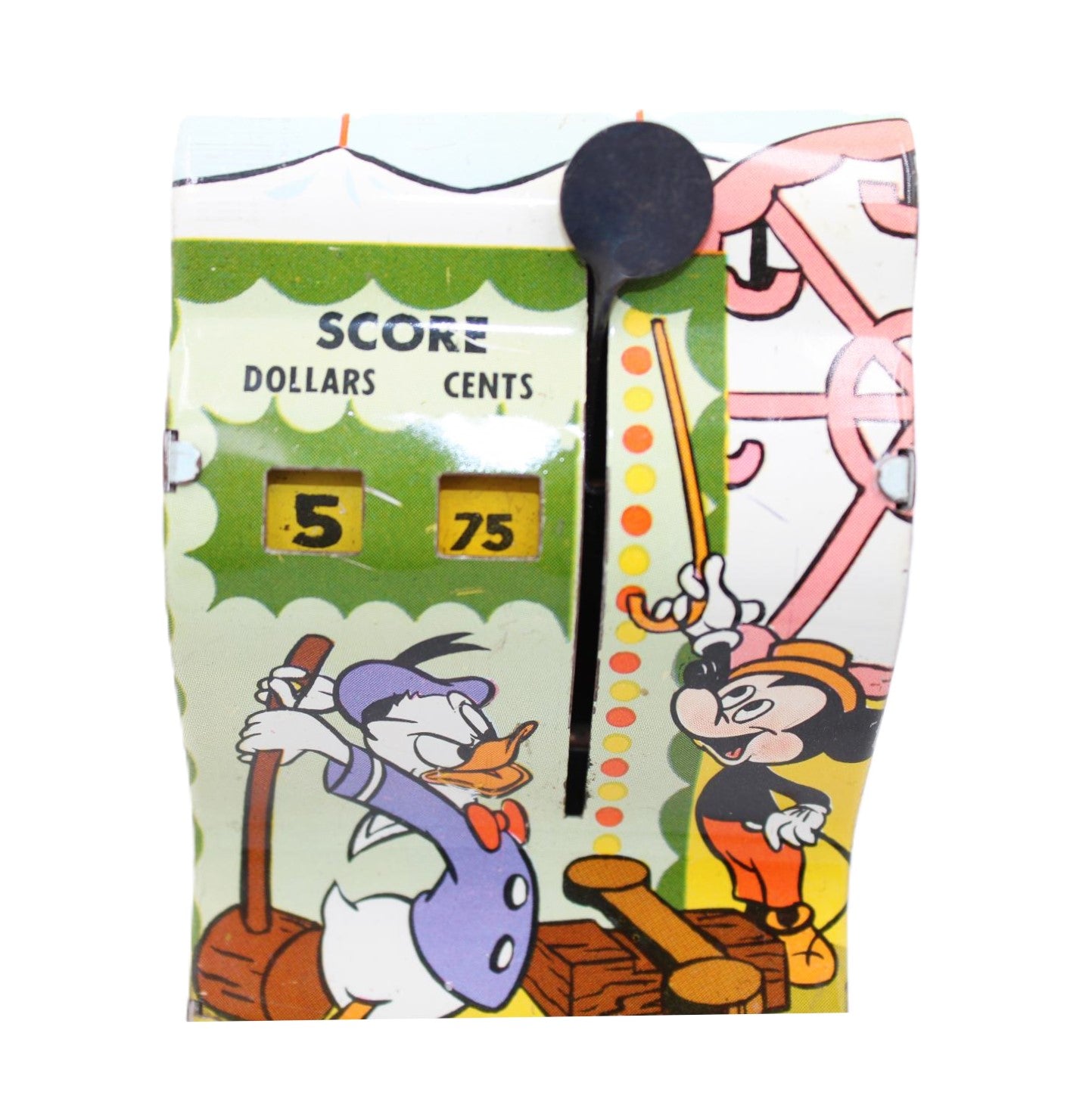 This wonderful tin litho coin bank measures only 4” high. All graphics on the bank are very clean with very minimal distractions. The bank is loaded with images of various Disney characters attending a carnival. The bank accepts dimes, nickels, and quarters and the counter is in good working order.
