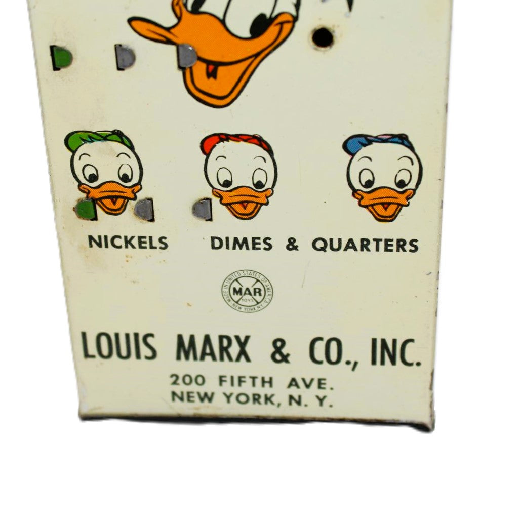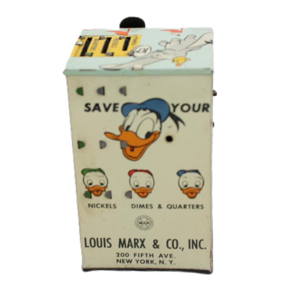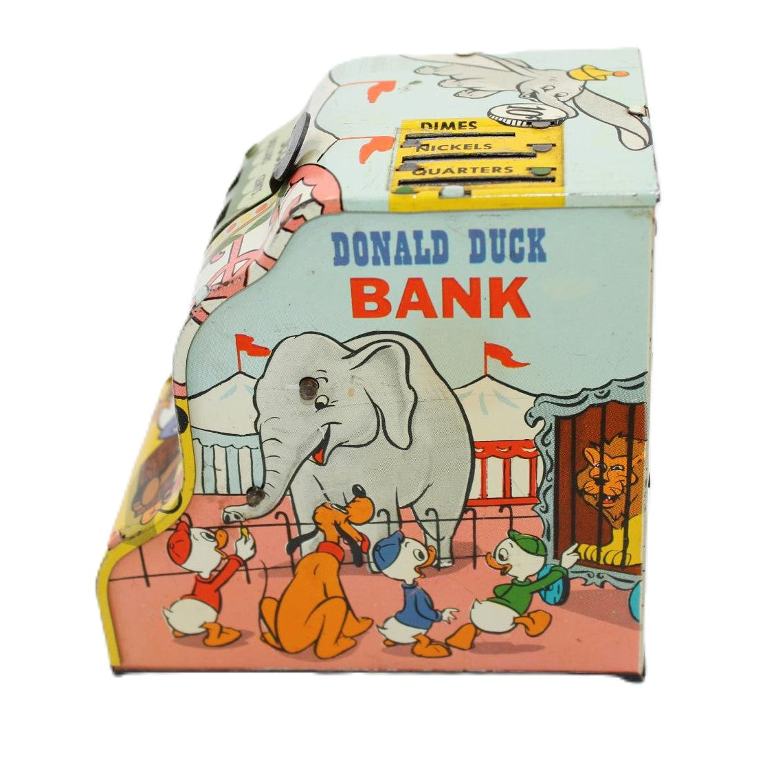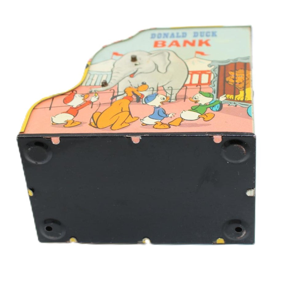 This wonderful tin litho coin bank measures only 4” high. All graphics on the bank are very clean with very minimal distractions. The bank is loaded with images of various Disney characters attending a carnival. The bank accepts dimes, nickels, and quarters and the counter is in good working order.