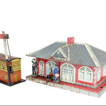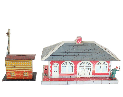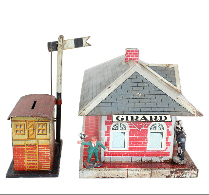 Marx Girard Tin-Litho Train Station with Whistle Connection & Non-Girard Train Building with Signal Flag